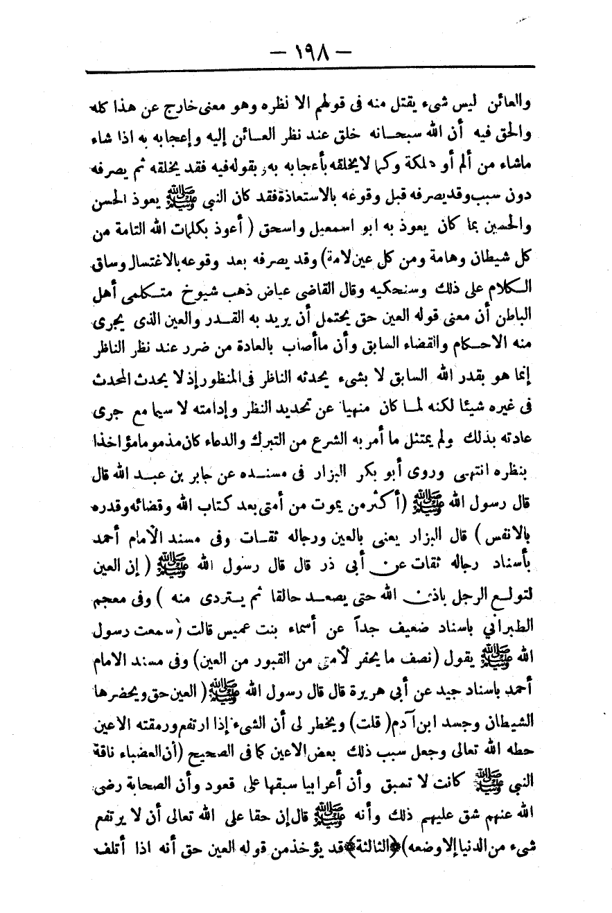 وَرَوَى أَبُو بَكْرٍ الْبَزَّارُ فِي مُسْنَدِهِ عَنْ جَابِرِ بْنِ عَبْدِ اللَّهِ قَالَ قَالَ رَسُولُ اللَّهِ - صَلَّى اللَّهُ عَلَيْهِ وَسَلَّمَ - «أَكْثَرُ مَنْ يَمُوتُ مِنْ أُمَّتِي بَعْدَ كِتَابِ اللَّهِ وَقَضَائِهِ وَقَدَرِهِ بِالْأَنْفُسِ» قَالَ الْبَزَّارُ يَعْنِي بِالْعَيْنِ، وَرِجَالُهُ ثِقَاتٌ.