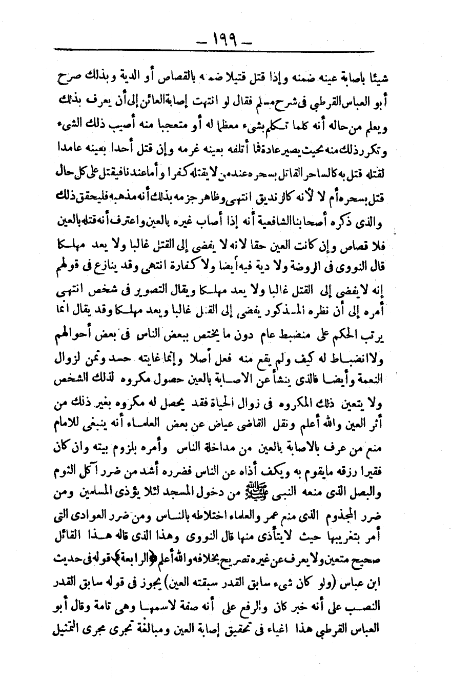 ـــــــــــــــــــــــــــــQشَيْئًا بِإِصَابَةِ عَيْنِهِ ضَمِنَهُ وَإِذَا قَتَلَ قَتِيلًا ضَمِنَهُ بِالْقِصَاصِ أَوْ الدِّيَةِ، وَبِذَلِكَ صَرَّحَ أَبُو الْعَبَّاسِ الْقُرْطُبِيُّ فِي شَرْحِ مُسْلِمٍ فَقَالَ لَوْ انْتَهَتْ إصَابَةُ الْعَائِنِ إلَى أَنْ يَعْرِفَ بِذَلِكَ وَيَعْلَمَ مِنْ حَالِهِ أَنَّهُ كُلَّمَا تَكَلَّمَ بِشَيْءٍ مُعَظِّمًا لَهُ أَوْ مُتَعَجِّبًا مِنْهُ أُصِيبَ ذَلِكَ الشَّيْءُ، وَتَكَرَّرَ ذَلِكَ مِنْهُ بِحَيْثُ يَصِيرُ عَادَةً فَمَا أَتْلَفَهُ بِعَيْنِهِ غَرِمَهُ وَإِنْ قَتَلَ أَحَدًا بِعَيْنِهِ عَامِدًا لِقَتْلِهِ قُتِلَ بِهِ كَالسَّاحِرِ الْقَاتِلِ بِسِحْرِهِ عِنْدَ مَنْ لَا يَقْتُلُهُ كُفْرًا وَأَمَّا عِنْدَنَا فَيُقْتَلُ عَلَى كُلِّ حَالٍ قَتَلَ بِسِحْرِهِ أَمْ لَا؛ لِأَنَّهُ كَالزِّنْدِيقِ انْتَهَى.