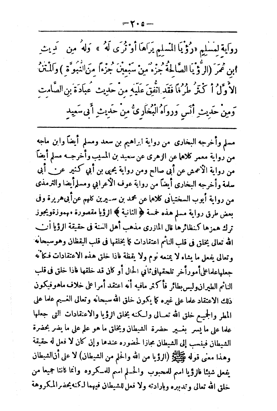 (الثَّانِيَةُ) الرُّؤْيَا مَقْصُورَةٌ مَهْمُوزَةٌ وَيَجُوزُ تَرْكُ هَمْزِهَا كَنَظَائِرِهَا قَالَ الْمَازِرِيُّ مَذْهَبُ أَهْلِ السُّنَّةِ فِي حَقِيقَةِ الرُّؤْيَا أَنَّ اللَّهَ تَعَالَى يَخْلُقُ فِي قَلْبِ النَّائِمِ اعْتِقَادَاتٍ كَمَا يَخْلُقُهَا فِي قَلْبِ الْيَقْظَانِ، وَهُوَ سُبْحَانَهُ وَتَعَالَى يَفْعَلُ مَا يَشَاءُ لَا يَمْنَعُهُ نَوْمٌ وَلَا يَقَظَةٌ فَإِذَا خَلَقَ هَذِهِ الِاعْتِقَادَاتِ فَكَأَنَّهُ جَعَلَهَا عَلَمًا عَلَى أُمُورٍ أُخَرَ تَلْحَقُهَا فِي ثَانِي الْحَالِ أَوْ كَانَ قَدْ خَلَقَهَا فَإِذَا خَلَقَ فِي قَلْبِ النَّائِمِ الطَّيَرَانَ وَلَيْسَ بِطَائِرٍ فَأَكْثَرُ مَا فِيهِ أَنَّهُ اعْتَقَدَ أَمْرًا عَلَى خِلَافِ مَا هُوَ فَيَكُونُ ذَلِكَ الِاعْتِقَادُ عَلَمًا عَلَى غَيْرِهِ كَمَا يَكُونُ خَلْقُ اللَّهِ سُبْحَانَهُ وَتَعَالَى الْغَيْمَ عَلَمًا عَلَى الْمَطَرِ وَالْجَمِيعُ خَلْقُ اللَّهِ تَعَالَى وَلَكِنَّهُ يَخْلُقُ الرُّؤْيَا وَالِاعْتِقَادَاتِ الَّتِي جَعَلَهَا عَلَمًا عَلَى مَا يَسُرُّ بِغَيْرِ حَضْرَةِ الشَّيْطَانِ وَيَخْلُقُ مَا هُوَ عَلَمٌ عَلَى مَا يَضُرُّ بِحَضْرَةِ الشَّيْطَانِ فَيُنْسَبُ إلَى الشَّيْطَانِ مَجَازًا لِحُضُورِهِ عِنْدَهَا، وَإِنْ كَانَ لَا فِعْلَ لَهُ حَقِيقَةً وَهَذَا مَعْنَى قَوْلِهِ - صَلَّى اللَّهُ عَلَيْهِ وَسَلَّمَ - «الرُّؤْيَا مِنْ اللَّهِ وَالْحُلْمُ مِنْ الشَّيْطَانِ» لَا عَلَى أَنَّ الشَّيْطَانَ يَفْعَلُ شَيْئًا فَالرُّؤْيَا اسْمٌ لِلْمَحْبُوبِ وَالْحُلْمُ اسْمٌ لِلْمَكْرُوهِ وَإِنَّمَا كَانَتَا جَمِيعًا مِنْ خَلْقِ اللَّهِ تَعَالَى وَتَدْبِيرِهِ وَبِإِرَادَتِهِ وَلَا فِعْلَ لِلشَّيْطَانِ فِيهِمَا لَكِنَّهُ يَحْضُرُ الْمَكْرُوهَةَ