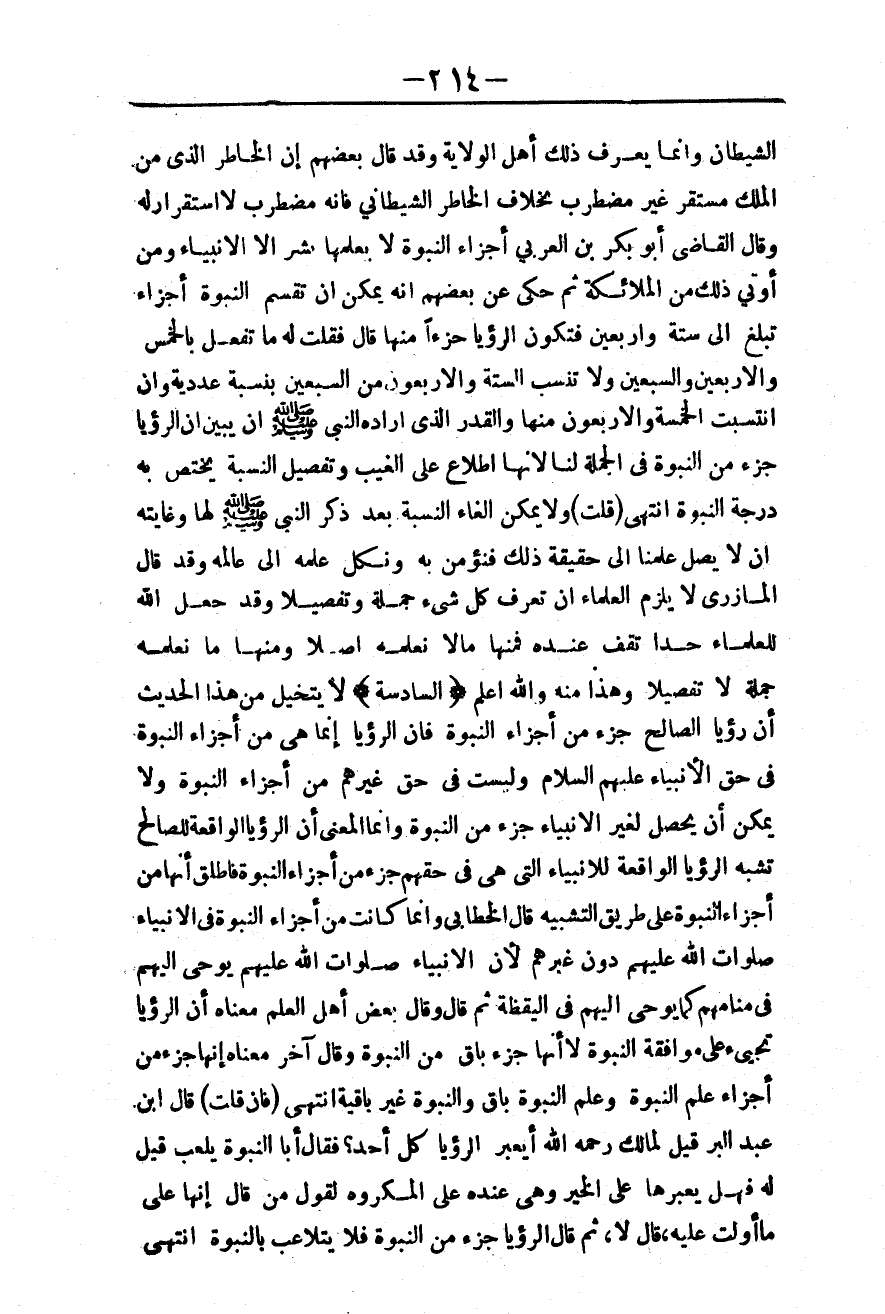 ـــــــــــــــــــــــــــــQالشَّيْطَانِ وَإِنَّمَا يَعْرِفُ ذَلِكَ أَهْلُ الْوِلَايَةِ، وَقَدْ قَالَ بَعْضُهُمْ إنَّ الْخَاطِرَ الَّذِي مِنْ الْمَلَكِ مُسْتَقِرٌّ غَيْرُ مُضْطَرِبٍ بِخِلَافِ الْخَاطِرِ الشَّيْطَانِيِّ فَإِنَّهُ مُضْطَرِبٌ لَا اسْتِقْرَارَ لَهُ وَقَالَ الْقَاضِي أَبُو بَكْرِ بْنُ الْعَرَبِيِّ أَجْزَاءُ النُّبُوَّةِ لَا يَعْلَمُهَا بَشَرٌ إلَّا الْأَنْبِيَاءُ وَمَنْ أُوتِيَ ذَلِكَ مِنْ الْمَلَائِكَةِ، ثُمَّ حُكِيَ عَنْ بَعْضِهِمْ أَنَّهُ يُمْكِنُ أَنْ تُقَسَّمَ النُّبُوَّةُ أَجْزَاءً تَبْلُغُ إلَى سِتَّةٍ وَأَرْبَعِينَ فَتَكُونُ الرُّؤْيَا جُزْءًا مِنْهَا قَالَ فَقُلْت لَهُ مَا تَفْعَلُ بِالْخَمْسِ وَالْأَرْبَعِينَ وَالسَّبْعِينَ وَلَا تُنْسَبُ السِّتَّةُ وَالْأَرْبَعُونَ مِنْ السَّبْعِينَ بِنِسْبَةٍ عَدَدِيَّةٍ، وَإِنْ انْتَسَبَتْ الْخَمْسَةُ وَالْأَرْبَعُونَ مِنْهَا وَالْقَدْرُ الَّذِي أَرَادَهُ النَّبِيُّ - صَلَّى اللَّهُ عَلَيْهِ وَسَلَّمَ - أَنْ يُبَيِّنَ أَنَّ الرُّؤْيَا جُزْءٌ مِنْ النُّبُوَّةِ فِي الْجُمْلَةِ لَنَا لِأَنَّهَا اطِّلَاعٌ عَلَى الْغَيْبِ وَتَفْصِيلُ النِّسْبَةِ يَخْتَصُّ بِهِ دَرَجَةُ النُّبُوَّةِ انْتَهَى.