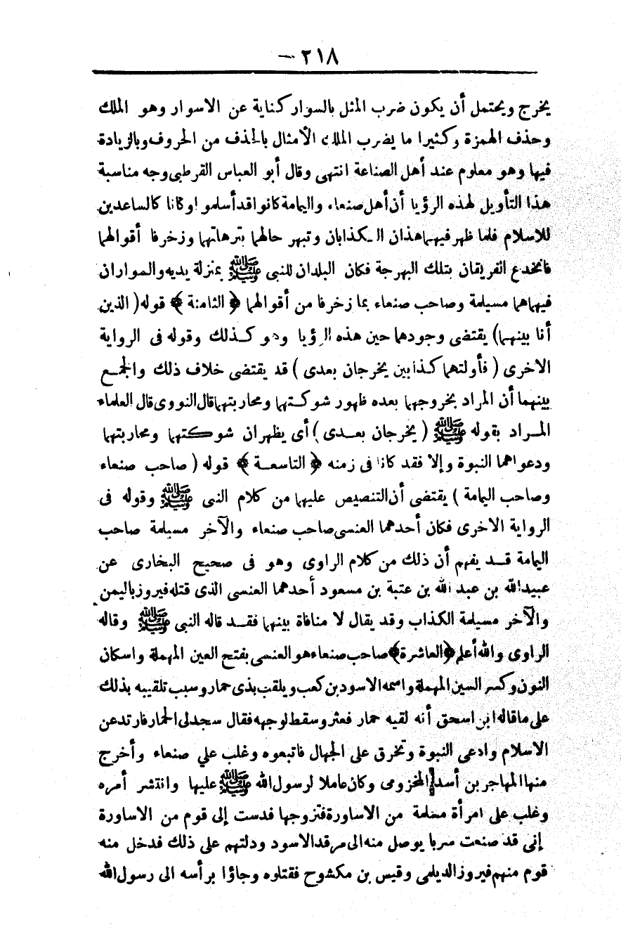 (التَّاسِعَةُ) قَوْلُهُ (صَاحِبُ صَنْعَاءَ وَصَاحِبُ الْيَمَامَةِ) يَقْتَضِي أَنَّ التَّنْصِيصَ عَلَيْهِمَا مِنْ كَلَامِ النَّبِيِّ - صَلَّى اللَّهُ عَلَيْهِ وَسَلَّمَ - وَقَوْلُهُ فِي الرِّوَايَةِ الْأُخْرَى فَكَانَ أَحَدُهُمَا الْعَنْسِيَّ صَاحِبُ صَنْعَاءَ وَالْآخَرُ مُسَيْلِمَةُ صَاحِبُ الْيَمَامَةِ قَدْ يُفْهَمُ أَنَّ ذَلِكَ مِنْ كَلَامِ الرَّاوِي، وَهُوَ فِي صَحِيحِ الْبُخَارِيِّ عَنْ عُبَيْدِ اللَّهِ بْنِ عَبْدِ اللَّهِ بْنِ عُتْبَةَ بْنِ مَسْعُودٍ أَحَدُهُمَا الْعَنْسِيُّ الَّذِي قَتَلَهُ فَيْرُوزُ بِالْيَمَنِ وَالْآخَرُ مُسَيْلِمَةُ الْكَذَّابُ.