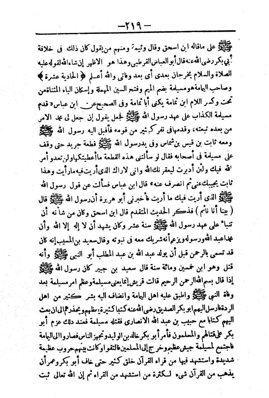 قَالَ سَعِيدُ بْنُ جُبَيْرٍ كَانَ رَسُولُ اللَّهِ - صَلَّى اللَّهُ عَلَيْهِ وَسَلَّمَ - إذَا قَالَ بِسْمِ اللَّهِ الرَّحْمَنِ الرَّحِيمِ قَالَتْ قُرَيْشٌ إنَّمَا يَعْنِي مُسَيْلِمَةَ وَعَظُمَ أَمْرُ مُسَيْلِمَةَ بَعْدَ وَفَاةِ النَّبِيِّ - صَلَّى اللَّهُ عَلَيْهِ وَسَلَّمَ - وَأَطْبَقَ عَلَيْهِ أَهْلُ الْيَمَامَةِ وَانْضَافَ إلَيْهِ بَشَرٌ كَثِيرٌ مِنْ أَهْلِ الرِّدَّةِ فَأَرْسَلَ إلَيْهِمْ أَبُو بَكْرٍ الصِّدِّيقُ - رَضِيَ اللَّهُ عَنْهُ - كُتُبًا كَثِيرَةً يَعِظُهُمْ وَيُحَذِّرُهُمْ إلَى أَنْ بَعَثَ إلَيْهِمْ كِتَابًا مَعَ حَبِيبِ بْنِ عَبْدِ اللَّهِ الْأَنْصَارِيِّ فَقَتَلَهُ مُسَيْلِمَةُ فَعِنْدَ ذَلِكَ عَزَمَ أَبُو بَكْرٍ عَلَى قِتَالِهِمْ وَالْمُسْلِمُونَ فَأَمَرَ أَبُو بَكْرٍ خَالِدَ بْنَ الْوَلِيدِ وَتَجَهَّزَ النَّاسُ فَصَارُوا إلَى الْيَمَامَةِ فَاجْتَمَعَ لِمُسَيْلِمَةَ جَيْشٌ عَظِيمٌ وَخَرَجَ إلَى الْمُسْلِمِينَ فَالْتَقَوْا وَكَانَتْ بَيْنَهُمْ حُرُوبٌ عَظِيمَةٌ شَدِيدَةٌ وَاسْتُشْهِدَ فِيهَا مِنْ قُرَّاءِ الْقُرْآنِ خَلْقٌ كَثِيرٌ حَتَّى خَافَ أَبُو بَكْرٍ وَعُمَرُ أَنْ يَذْهَبَ مِنْ الْقُرْآنِ شَيْءٌ لِكَثْرَةِ مَنْ اُسْتُشْهِدَ مِنْ الْقُرَّاءِ، ثُمَّ إنَّ اللَّهَ تَعَالَى ثَبَّتَ