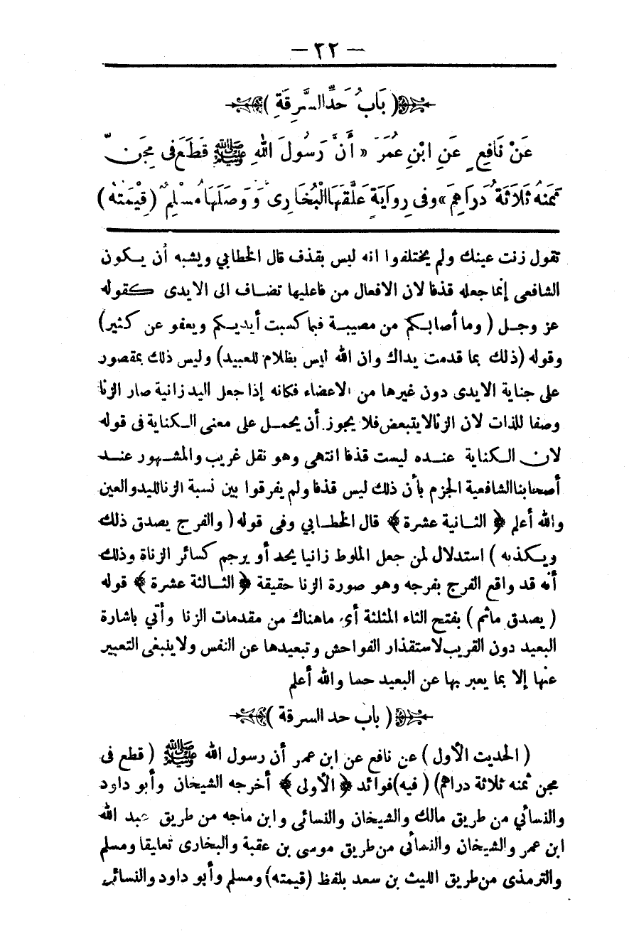 بَابُ حَدِّ السَّرِقَةِ عَنْ نَافِعٍ عَنْ ابْنِ عُمَرَ «أَنَّ رَسُولَ اللَّهِ - صَلَّى اللَّهُ عَلَيْهِ وَسَلَّمَ - قَطَعَ فِي مِجَنٍّ ثَمَنُهُ ثَلَاثَةُ دَرَاهِمَ» وَفِي رِوَايَةٍ عَلَّقَهَا الْبُخَارِيُّ وَوَصَلَهَا مُسْلِمٌ «قِيمَتُهُ:» .