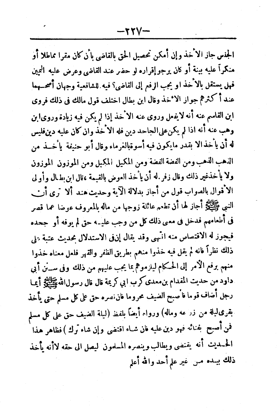 وَقَدْ يُقَالُ إنَّ فِي الِاسْتِدْلَالِ بِحَدِيثِ عُتْبَةَ عَلَى ذَلِكَ نَظَرٌ فَإِنَّهُ لَمْ يَقُلْ فِيهِ خُذُوا مِنْهُمْ بِطَرِيقِ الظَّفَرِ وَالْقَهْرِ فَلَعَلَّ مَعْنَاهُ خُذُوا مِنْهُمْ بِرَفْعِ الْأَمْرِ إلَى الْحُكَّامِ لِيُلْزِمُوهُمْ بِمَا يَجِبُ عَلَيْهِمْ مِنْ ذَلِكَ، وَفِي سُنَنِ أَبِي دَاوُد مِنْ حَدِيثِ الْمِقْدَامِ بْنِ مَعْدِي كَرِبَ أَبِي كَرِيمَةَ قَالَ قَالَ رَسُولُ اللَّهِ - صَلَّى اللَّهُ عَلَيْهِ وَسَلَّمَ - «أَيُّمَا رَجُلٍ أَضَافَ قَوْمًا فَأَصْبَحَ الضَّيْفُ مَحْرُومًا فَإِنَّ نَصْرَهُ حَقٌّ عَلَى كُلِّ مُسْلِمٍ حَتَّى يَأْخُذَ بِقِرَى لَيْلَةٍ مِنْ زَرْعِهِ وَمَالِهِ» وَرَوَاهُ أَيْضًا بِلَفْظِ «لَيْلَةُ الضَّيْفِ حَقٌّ عَلَى كُلِّ مُسْلِمٍ فَمَنْ أَصْبَحَ بِفِنَائِهِ فَهُوَ دَيْنٌ عَلَيْهِ فَإِنْ شَاءَ اقْتَضَى، وَإِنْ شَاءَ تَرَكَ» فَظَاهِرُ هَذَا الْحَدِيثِ أَنَّهُ يَقْتَضِي وَيُطَالِبُ وَيَنْصُرُهُ الْمُسْلِمُونَ لِيَصِلَ إلَى حَقِّهِ لَا أَنَّهُ يَأْخُذُ ذَلِكَ بِيَدِهِ مِنْ غَيْرِ عِلْمِ أَحَدٍ وَاَللَّهُ أَعْلَمُ.