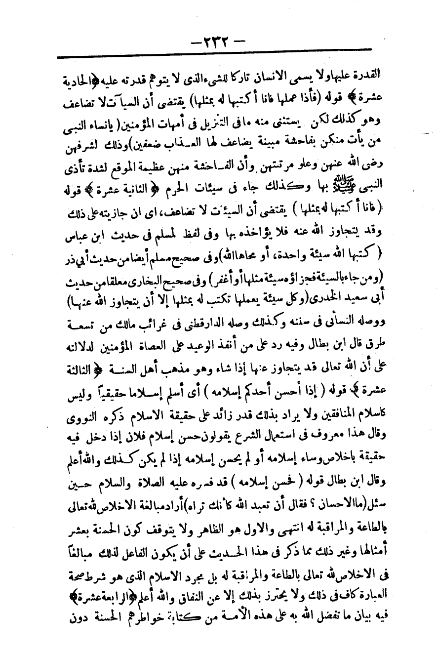 (الثَّانِيَةَ عَشْرَةَ) قَوْلُهُ «فَأَنَا أَكْتُبُهَا لَهُ بِمِثْلِهَا» يَقْتَضِي أَنَّ السَّيِّئَاتِ لَا تُضَاعَفُ، أَيْ إنْ جَازِيَتُهُ عَلَى ذَلِكَ، وَقَدْ يَتَجَاوَزُ اللَّهُ عَنْهُ فَلَا يُؤَاخِذُهُ بِهَا وَفِي لَفْظٍ لِمُسْلِمٍ فِي حَدِيثِ ابْنِ عَبَّاسٍ «كَتَبَهَا اللَّهُ سَيِّئَةً وَاحِدَةً، أَوْ مَحَاهَا اللَّهُ» .
