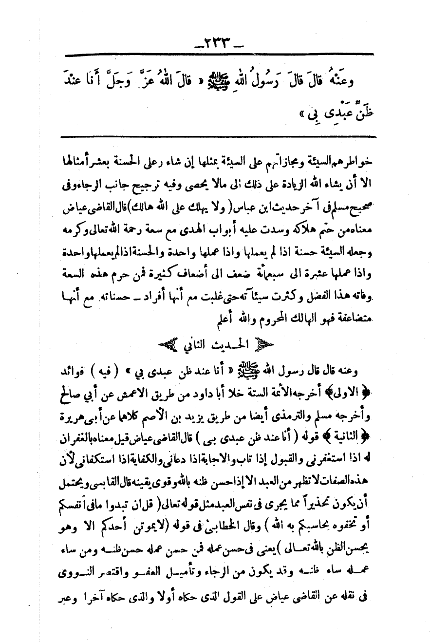 الْحَدِيثُ الثَّانِي وَعَنْهُ قَالَ قَالَ رَسُولُ اللَّهِ: - صَلَّى اللَّهُ عَلَيْهِ وَسَلَّمَ - «أَنَا عِنْدَ ظَنِّ عَبْدِي بِي» (فِيهِ) فَوَائِدُ: