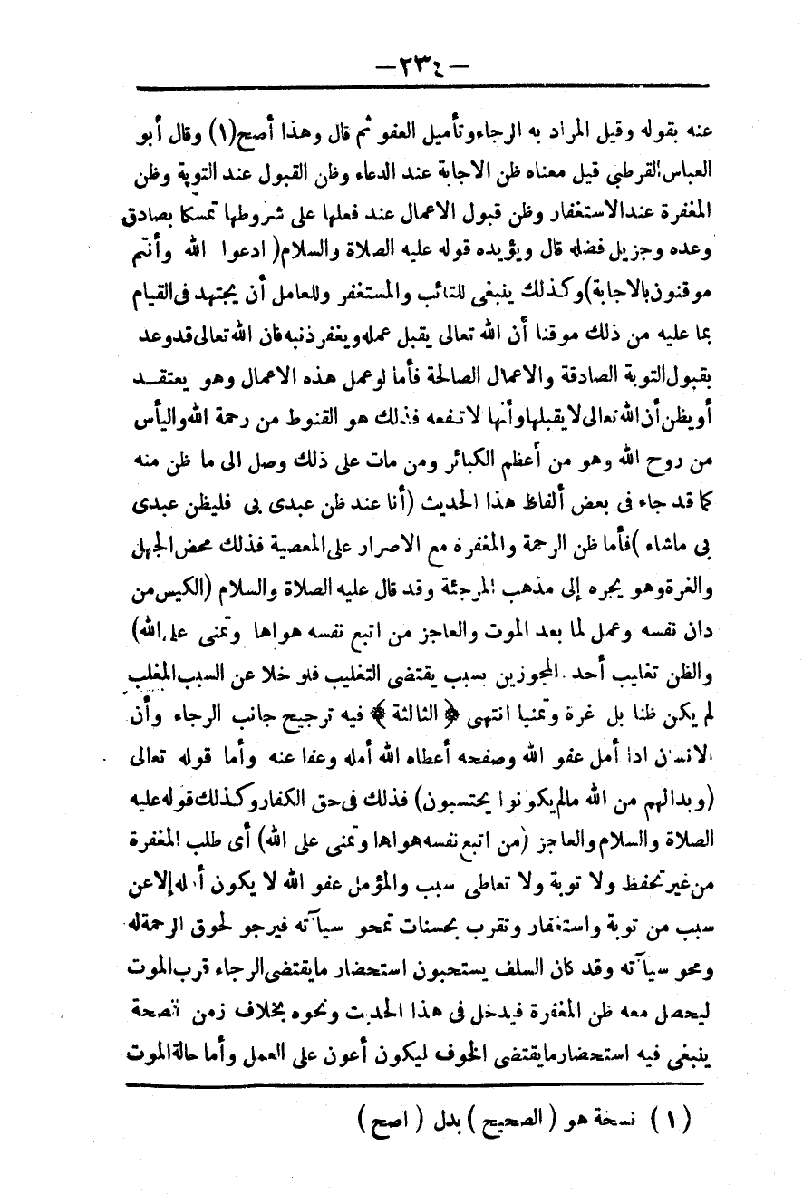 ـــــــــــــــــــــــــــــQعَنْهُ بِقَوْلِهِ وَقِيلَ الْمُرَادُ بِهِ الرَّجَاءُ وَتَأْمِيلُ الْعَفْوِ. ثُمَّ قَالَ وَهَذَا أَصَحُّ.