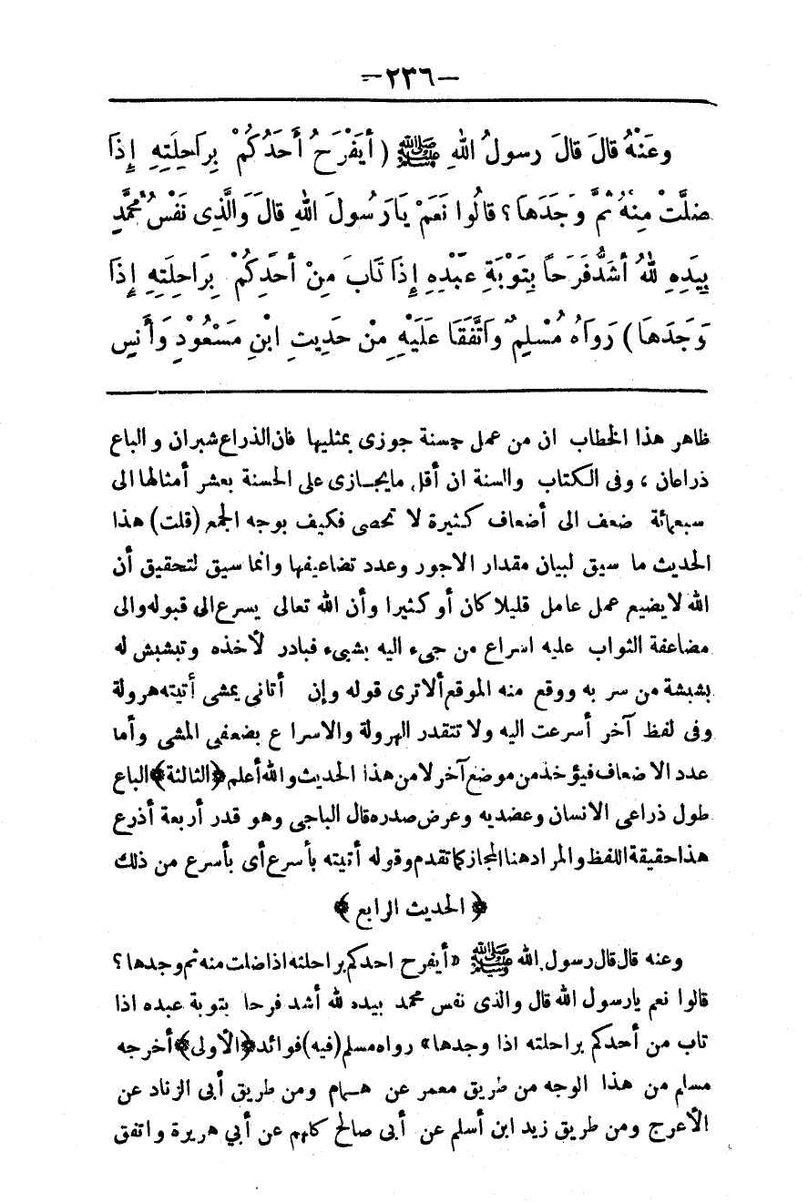 (الْحَدِيثُ الرَّابِعُ) وَعَنْهُ قَالَ قَالَ رَسُولُ اللَّهِ - صَلَّى اللَّهُ عَلَيْهِ وَسَلَّمَ - «أَيَفْرَحُ أَحَدُكُمْ بِرَاحِلَتِهِ إذَا ضَلَّتْ مِنْهُ، ثُمَّ وَجَدَهَا؟ قَالُوا نَعَمْ يَا رَسُولَ اللَّهِ قَالَ وَاَلَّذِي نَفْسُ مُحَمَّدٍ بِيَدِهِ لَلَّهُ أَشَدُّ فَرَحًا بِتَوْبَةِ عَبْدِهِ إذَا تَابَ مِنْ أَحَدِكُمْ بِرَاحِلَتِهِ إذَا وَجَدَهَا» رَوَاهُ مُسْلِمٌ.