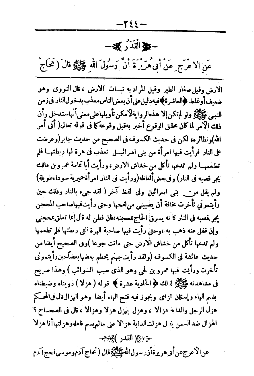 الْقَدَرُ عَنْ الْأَعْرَجِ عَنْ أَبِي هُرَيْرَةَ أَنَّ رَسُولَ اللَّهِ - صَلَّى اللَّهُ عَلَيْهِ وَسَلَّمَ - قَالَ: «تَحَاجَّ آدَم وَمُوسَى فَحَجَّ آدَم