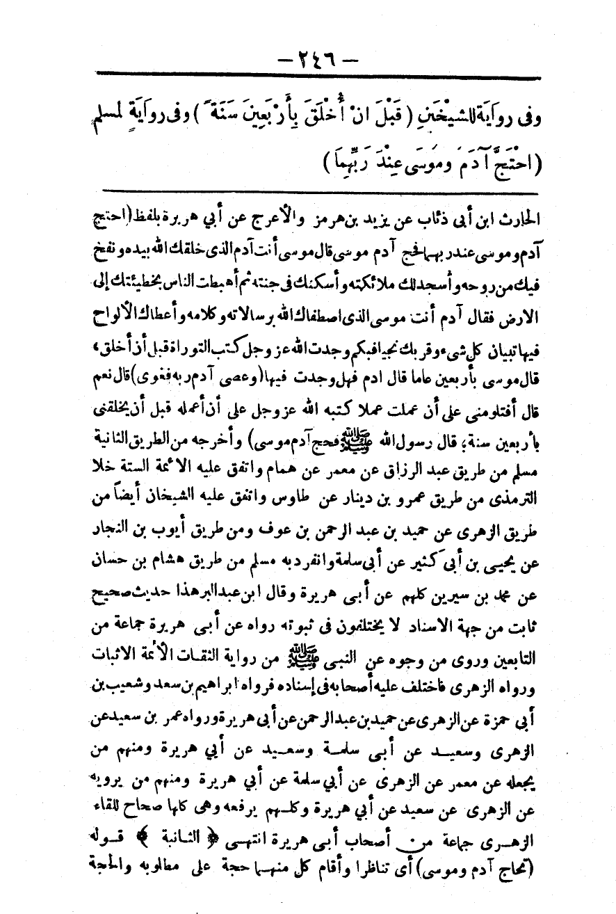 ـــــــــــــــــــــــــــــQالْحَارِثِ بْنِ أَبِي ذِئَابٍ عَنْ يَزِيدَ بْنِ هُرْمُزَ وَالْأَعْرَجِ عَنْ أَبِي هُرَيْرَةَ بِلَفْظِ «احْتَجَّ آدَم وَمُوسَى عِنْدَ رَبِّهِمَا فَحَجَّ آدَم مُوسَى قَالَ مُوسَى أَنْتَ آدَم الَّذِي خَلَقَك اللَّهُ بِيَدِهِ وَنَفَخَ فِيك مِنْ رُوحِهِ وَأَسْجَدَ لَك مَلَائِكَتَهُ وَأَسْكَنَك فِي جَنَّتِهِ، ثُمَّ أَهَبَطْتَ النَّاسَ بِخَطِيئَتِك إلَى الْأَرْضِ فَقَالَ آدَم أَنْتَ مُوسَى الَّذِي اصْطَفَاك اللَّهُ بِرِسَالَاتِهِ وَكَلَامِهِ وَأَعْطَاك الْأَلْوَاحَ فِيهَا تِبْيَانُ كُلِّ شَيْءٍ وَقَرَّبَكَ نَجِيًّا، فَبِكَمْ وَجَدْتَ اللَّهَ عَزَّ وَجَلَّ كَتَبَ التَّوْرَاةَ قَبْلَ أَنْ أُخْلَقَ، قَالَ مُوسَى: بِأَرْبَعِينَ عَامًا قَالَ آدَم فَهَلْ وَجَدْتَ فِيهَا {وَعَصَى آدَمُ رَبَّهُ فَغَوَى} [طه: 121] قَالَ نَعَمْ قَالَ: أَفَتَلُومُنِي عَلَى أَنْ عَمِلْتَ عَمَلًا كَتَبَهُ اللَّهُ عَزَّ وَجَلَّ عَلَيَّ أَنْ أَعْمَلَهُ قَبْلَ أَنْ يَخْلُقَنِي بِأَرْبَعِينَ سَنَةً؛ قَالَ رَسُولُ اللَّهِ - صَلَّى اللَّهُ عَلَيْهِ وَسَلَّمَ - فَحَجَّ آدَم مُوسَى» وَأَخْرَجَهُ مِنْ الطَّرِيقِ الثَّانِيَةِ مُسْلِمٌ مِنْ طَرِيقِ عَبْدِ الرَّزَّاقِ عَنْ مَعْمَرٍ عَنْ هَمَّامٍ وَاتَّفَقَ عَلَيْهِ الْأَئِمَّةُ السِّتَّةُ خَلَا التِّرْمِذِيَّ مِنْ طَرِيقِ عَمْرِو بْنِ دِينَارٍ عَنْ طَاوُسٍ وَاتَّفَقَ عَلَيْهِ الشَّيْخَانِ أَيْضًا مِنْ طَرِيقِ الزُّهْرِيِّ عَنْ حُمَيْدٍ بْنِ عَبْدِ الرَّحْمَنِ بْنِ عَوْفٍ وَمِنْ طَرِيقِ أَيُّوبَ بْنِ النَّجَّارِ عَنْ يَحْيَى بْنِ أَبِي كُثَيِّرٌ عَنْ أَبِي سَلَمَةَ وَانْفَرَدَ بِهِ مُسْلِمٌ مِنْ طَرِيقِ هِشَامِ بْنِ حَسَّانَ عَنْ مُحَمَّدِ بْنِ سِيرِينَ كُلُّهُمْ عَنْ أَبِي هُرَيْرَةَ وَقَالَ ابْنُ عَبْدِ الْبَرِّ هَذَا حَدِيثٌ صَحِيحٌ ثَابِتٌ مِنْ جِهَةِ الْإِسْنَادِ لَا يَخْتَلِفُونَ فِي ثُبُوتِهِ رَوَاهُ عَنْ أَبِي هُرَيْرَةَ جَمَاعَةٌ مِنْ التَّابِعِينَ وَرُوِيَ مِنْ وُجُوهٍ عَنْ النَّبِيِّ - صَلَّى اللَّهُ عَلَيْهِ وَسَلَّمَ - مِنْ رِوَايَةِ الثِّقَاتِ أَئِمَّةِ الْإِثْبَاتِ وَرَوَاهُ الزُّهْرِيُّ فَاخْتَلَفَ عَلَيْهِ أَصْحَابُهُ فِي إسْنَادِهِ فَرَوَاهُ إبْرَاهِيمُ بْنُ سَعْدٍ وَشُعَيْبُ بْنُ أَبِي حَمْزَةَ عَنْ الزُّهْرِيِّ عَنْ حُمَيْدٍ بْنِ عَبْدِ الرَّحْمَنِ عَنْ أَبِي هُرَيْرَةَ وَرَوَاهُ عُمَرُ بْنُ سَعِيدٍ عَنْ الزُّهْرِيِّ وَسَعِيدٍ عَنْ أَبِي سَلَمَةَ وَسَعِيدٍ عَنْ أَبِي هُرَيْرَةَ وَمِنْهُمْ مَنْ يَجْعَلُهُ عَنْ مَعْمَرٍ عَنْ الزُّهْرِيِّ عَنْ أَبِي سَلَمَةَ عَنْ أَبِي هُرَيْرَةَ وَمِنْهُمْ مَنْ يَرْوِيهِ عَنْ الزُّهْرِيِّ عَنْ سَعِيدٍ عَنْ أَبِي هُرَيْرَةَ وَكُلُّهُمْ يَرْفَعُهُ وَهِيَ كُلُّهَا صِحَاحٌ لِلِقَاءِ الزُّهْرِيِّ جَمَاعَةً مِنْ أَصْحَابِ أَبِي هُرَيْرَةَ انْتَهَى.