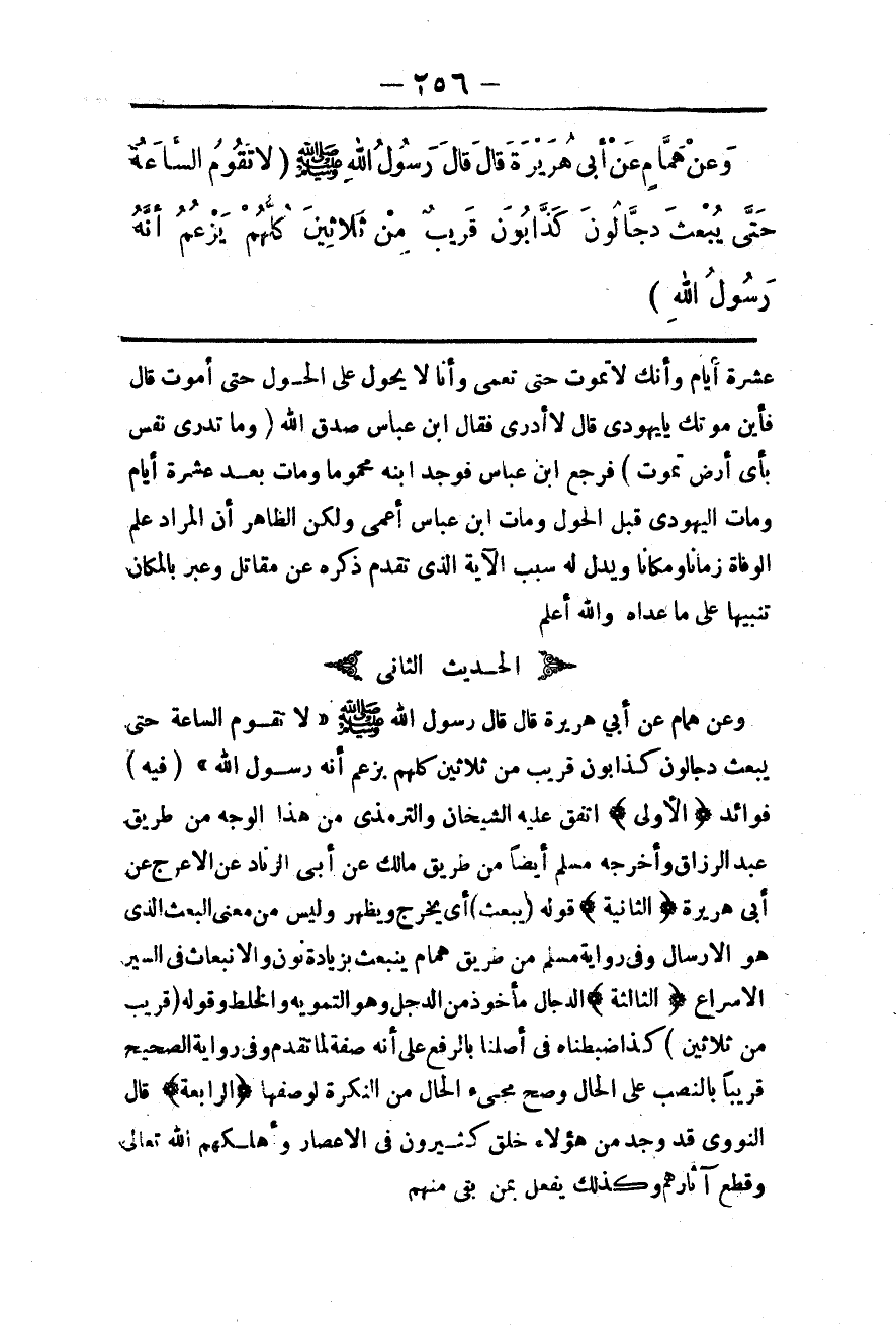 الْحَدِيثُ الثَّانِي وَعَنْ هَمَّامٍ عَنْ أَبِي هُرَيْرَةَ قَالَ قَالَ رَسُولُ اللَّهِ: - صَلَّى اللَّهُ عَلَيْهِ وَسَلَّمَ - «لَا تَقُومُ السَّاعَةُ حَتَّى يُبْعَثَ دَجَّالُونَ كَذَّابُونَ قَرِيبٌ مِنْ ثَلَاثِينَ كُلُّهُمْ يَزْعُمُ أَنَّهُ رَسُولُ اللَّهِ» (فِيهِ) فَوَائِدُ: