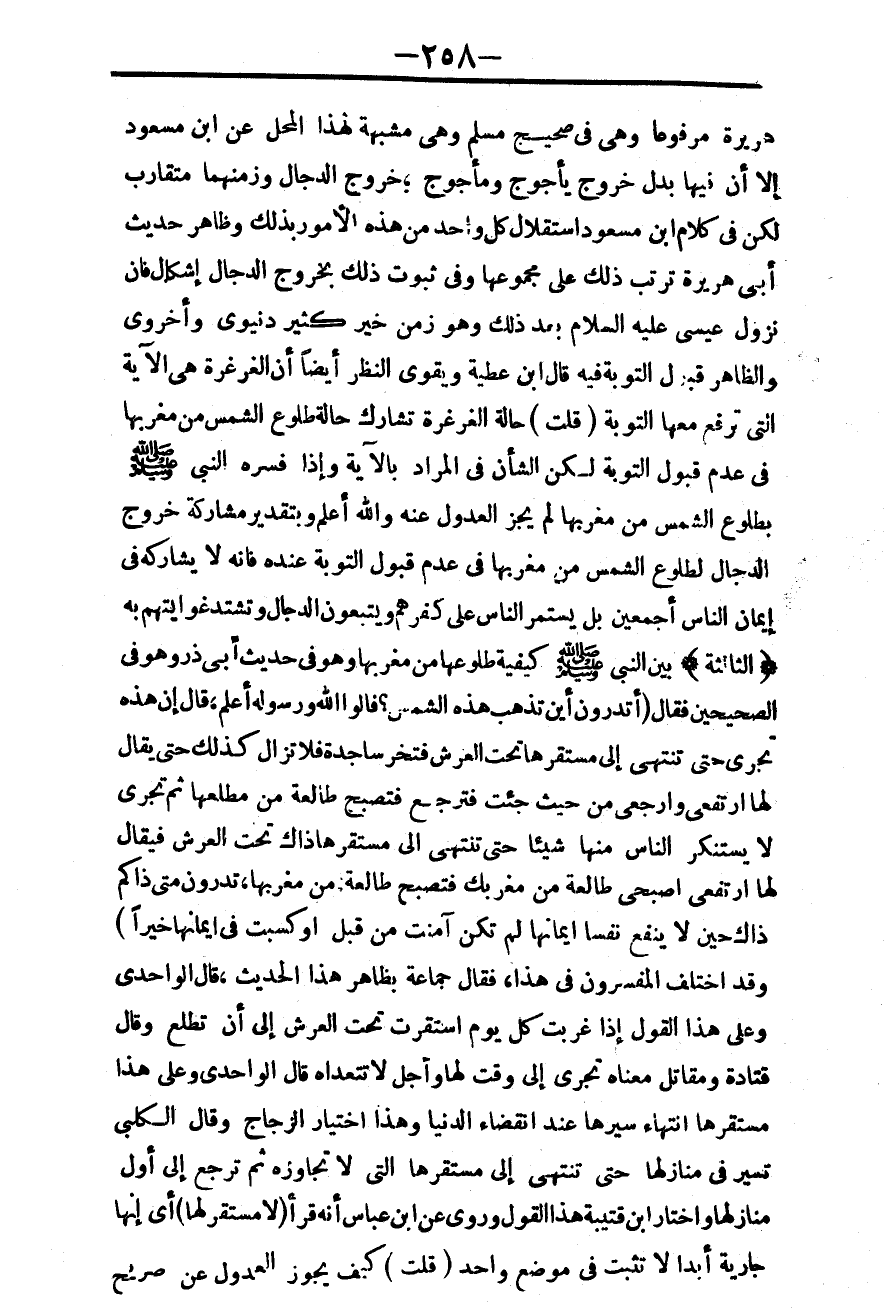 ـــــــــــــــــــــــــــــQمَرْفُوعًا وَهِيَ فِي صَحِيحِ مُسْلِمٍ وَهِيَ مُشْبِهَةٌ لِهَذَا الْمَحَلِّ عَنْ ابْنِ مَسْعُودٍ إلَّا أَنَّ فِيهَا بَدَلَ خُرُوجِ يَأْجُوجَ وَمَأْجُوجَ؛ خُرُوجَ الدَّجَّالِ وَزَمَنُهُمَا مُتَقَارِبٌ لَكِنْ فِي كَلَامِ ابْنِ مَسْعُودٍ اسْتِقْلَالُ كُلِّ وَاحِدٍ مِنْ هَذِهِ الْأُمُورِ بِذَلِكَ وَظَاهِرُ حَدِيثِ أَبِي هُرَيْرَةَ تَرَتُّبُ ذَلِكَ عَلَى مَجْمُوعِهَا، وَفِي ثُبُوتِ ذَلِكَ بِخُرُوجِ الدَّجَّالِ إشْكَالٌ فَإِنَّ نُزُولَ عِيسَى - عَلَيْهِ السَّلَامُ - بَعْدَ ذَلِكَ، وَهُوَ زَمَنُ خَيْرٍ كَثِيرٍ دُنْيَوِيٍّ وَأُخْرَوِيٍّ، وَالظَّاهِرُ قَبُولُ التَّوْبَةِ قَالَ ابْنُ عَطِيَّةَ وَيُقَوِّي النَّظَرَ أَيْضًا أَنَّ الْغَرْغَرَةَ هِيَ الْآيَةُ الَّتِي تُرْفَعُ مَعَهَا التَّوْبَةُ (قُلْت) حَالَةُ الْغَرْغَرَةِ تُشَارِكُ حَالَةَ طُلُوعِ الشَّمْسِ مِنْ مَغْرِبِهَا فِي عَدَمِ قَبُولِ التَّوْبَةِ لَكِنَّ الشَّأْنَ فِي الْمُرَادِ بِالْآيَةِ وَإِذَا فَسَّرَهُ النَّبِيُّ - صَلَّى اللَّهُ عَلَيْهِ وَسَلَّمَ - بِطُلُوعِ الشَّمْسِ مِنْ مَغْرِبِهَا لَمْ يَجُزْ الْعُدُولُ عَنْهُ وَاَللَّهُ أَعْلَمُ وَبِتَقْدِيرِ مُشَارَكَةِ خُرُوجِ الدَّجَّالِ لِطُلُوعِ الشَّمْسِ مِنْ مَغْرِبِهَا فِي عَدَمِ قَبُولِ التَّوْبَةِ عِنْدَهُ فَإِنَّهُ لَا يُشَارِكُهُ فِي إيمَانِ النَّاسِ أَجْمَعِينَ بَلْ يَسْتَمِرُّ النَّاسُ عَلَى كُفْرِهِمْ وَيَتَّبِعُونَ الدَّجَّالَ وَتَشْتَدُّ غَوَايَتُهُمْ بِهِ.