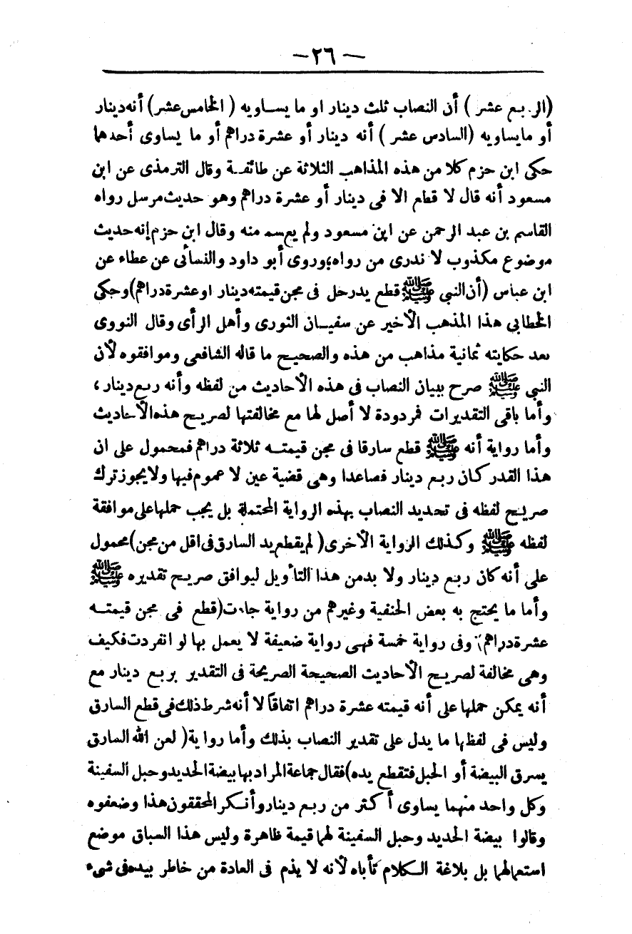 (السَّادِسَ عَشَرَ) : أَنَّهُ دِينَارٌ أَوْ عَشَرَةُ دَرَاهِمَ أَوْ مَا يُسَاوِي أَحَدَهُمَا حَكَى ابْنُ حَزْمٍ كُلًّا مِنْ هَذِهِ الْمَذَاهِبِ الثَّلَاثَةِ عَنْ طَائِفَةٍ وَقَالَ التِّرْمِذِيُّ عَنْ ابْنِ مَسْعُودٍ إنَّهُ قَالَ لَا قَطْعَ إلَّا فِي دِينَارٍ أَوْ عَشَرَةِ دَرَاهِمَ وَهُوَ حَدِيثٌ مُرْسَلٌ رَوَاهُ الْقَاسِمُ بْنُ عَبْدِ الرَّحْمَنِ عَنْ ابْنِ مَسْعُودٍ وَلَمْ يُسْمَعْ مِنْهُ وَقَالَ ابْنُ حَزْمٍ إنَّهُ حَدِيثٌ مَوْضُوعٌ مَكْذُوبٌ لَا نَدْرِي مَنْ رَوَاهُ؛ وَرَوَى أَبُو دَاوُد وَالنَّسَائِيُّ عَنْ عَطَاءٍ عَنْ ابْنِ عَبَّاسٍ «أَنَّ النَّبِيَّ - صَلَّى اللَّهُ عَلَيْهِ وَسَلَّمَ - قَطَعَ يَدَ رَجُلٍ فِي مِجَنٍّ قِيمَتُهُ دِينَارٌ أَوْ عَشَرَةُ دَرَاهِمَ:» وَحَكَى الْخَطَّابِيُّ هَذَا الْمَذْهَبَ الْأَخِيرَ عَنْ سُفْيَانَ الثَّوْرِيِّ وَأَهْلِ الرَّأْيِ وَقَالَ النَّوَوِيُّ بَعْدَ حِكَايَتِهِ ثَمَانِيَةَ مَذَاهِبَ مِنْ هَذِهِ وَالصَّحِيحُ مَا قَالَهُ الشَّافِعِيُّ وَمُوَافِقُوهُ؛ لِأَنَّ النَّبِيَّ - صَلَّى اللَّهُ عَلَيْهِ وَسَلَّمَ - صَرَّحَ بِبَيَانِ النِّصَابِ فِي هَذِهِ الْأَحَادِيثِ مِنْ لَفْظِهِ وَأَنَّهُ رُبُعُ دِينَارٍ.
