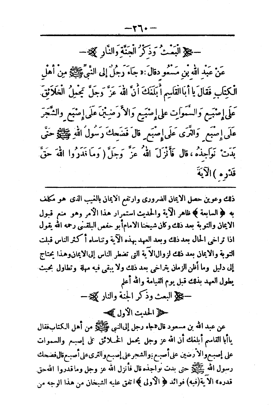 الْبَعْثُ وَذِكْرُ الْجَنَّةِ، وَالنَّارِ الْحَدِيثُ الْأَوَّلُ عَنْ عَبْدِ اللَّهِ بْنِ مَسْعُودٍ قَالَ «جَاءَ رَجُلٌ إلَى النَّبِيِّ - صَلَّى اللَّهُ عَلَيْهِ وَسَلَّمَ - مِنْ أَهْلِ الْكِتَابِ فَقَالَ يَا أَبَا الْقَاسِمِ أَبَلَغَك أَنَّ اللَّهَ عَزَّ وَجَلَّ يَحْمِلُ الْخَلَائِقَ عَلَى إصْبَعٍ، وَالسَّمَوَاتِ عَلَى إصْبَعٍ، وَالْأَرْضِينَ عَلَى أُصْبُعٍ: وَالشَّجَرَ عَلَى إصْبَعٍ، وَالثَّرَى عَلَى أُصْبُعٍ قَالَ فَضَحِكَ رَسُولُ اللَّهِ - صَلَّى اللَّهُ عَلَيْهِ وَسَلَّمَ - حَتَّى بَدَتْ نَوَاجِذُهُ قَالَ فَأَنْزَلَ اللَّهُ عَزَّ وَجَلَّ {وَمَا قَدَرُوا اللَّهَ حَقَّ قَدْرِهِ} [الزمر: 67] الْآيَةُ» (فِيهِ) فَوَائِدُ: