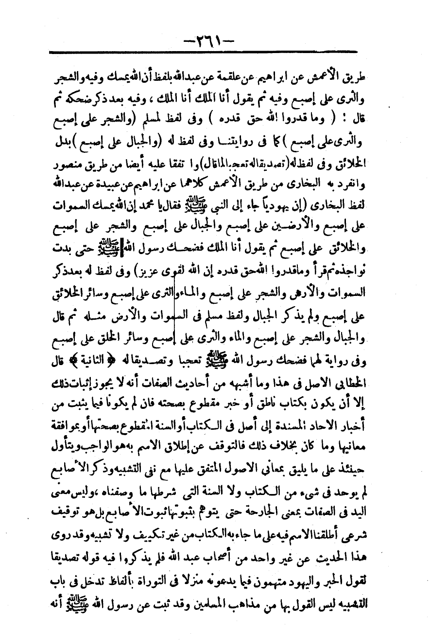 ـــــــــــــــــــــــــــــQطَرِيقِ الْأَعْمَشِ عَنْ إبْرَاهِيمَ عَنْ عَلْقَمَةَ عَنْ عَبْدِ اللَّهِ بِلَفْظٍ «إنَّ اللَّهَ يُمْسِكُ وَفِيهِ، وَالشَّجَرَ، وَالثَّرَى عَلَى إصْبَعٍ وَفِيهِ، ثُمَّ يَقُولُ أَنَا الْمَلِكُ أَنَا الْمَلِكُ، وَفِيهِ بَعْدَ ذِكْرِ ضَحِكِهِ، ثُمَّ قَالَ: {وَمَا قَدَرُوا اللَّهَ حَقَّ قَدْرِهِ} [الأنعام: 91] » ، وَفِي لَفْظٍ لِمُسْلِمٍ «، وَالشَّجَرَ عَلَى إصْبَعٍ، وَالثَّرَى عَلَى إصْبَعٍ» كَمَا فِي رِوَايَتِنَا، وَفِي لَفْظٍ لَهُ «، وَالْجِبَالَ عَلَى إصْبَعٍ» بَدَلَ الْخَلَائِقِ، وَفِي لَفْظٍ لَهُ «تَصْدِيقًا لَهُ تَعَجُّبًا لِمَا قَالَ» وَاتَّفَقَا عَلَيْهِ أَيْضًا مِنْ طَرِيقِ مَنْصُورٍ وَانْفَرَدَ بِهِ الْبُخَارِيُّ مِنْ طَرِيقِ الْأَعْمَشِ كِلَاهُمَا عَنْ إبْرَاهِيمَ عَنْ عُبَيْدَةَ عَنْ عَبْدِ اللَّهِ لَفْظُ الْبُخَارِيِّ «إنَّ يَهُودِيًّا جَاءَ إلَى النَّبِيِّ - صَلَّى اللَّهُ عَلَيْهِ وَسَلَّمَ - فَقَالَ يَا مُحَمَّدُ إنَّ اللَّهَ يُمْسِكُ السَّمَوَاتِ عَلَى إصْبَعٍ، وَالْأَرْضِينَ عَلَى إصْبَعٍ، وَالْجِبَالَ عَلَى إصْبَعٍ، وَالشَّجَرَ عَلَى إصْبَعٍ، وَالْخَلَائِقَ عَلَى إصْبَعٍ، ثُمَّ يَقُولُ أَنَا الْمَلِكُ فَضَحِكَ رَسُولُ اللَّهِ - صَلَّى اللَّهُ عَلَيْهِ وَسَلَّمَ - حَتَّى بَدَتْ نَوَاجِذُهُ، ثُمَّ قَرَأَ {مَا قَدَرُوا اللَّهَ حَقَّ قَدْرِهِ إِنَّ اللَّهَ لَقَوِيٌّ عَزِيزٌ} [الحج: 74] » ، وَفِي لَفْظٍ لَهُ بَعْدَ ذِكْرِ «السَّمَوَاتِ، وَالْأَرْضِ، وَالشَّجَرِ عَلَى إصْبَعٍ، وَالْمَاءِ، وَالثَّرَى عَلَى إصْبَعٍ وَسَائِرِ الْخَلَائِقِ عَلَى إصْبَعٍ» ، وَلَمْ يَذْكُرْ الْجِبَالَ وَلَفْظُ مُسْلِمٍ فِي السَّمَوَاتِ، وَالْأَرْضِ مِثْلُهُ، ثُمَّ قَالَ «، وَالْجِبَالَ، وَالشَّجَرَ عَلَى إصْبَعٍ، وَالْمَاءَ، وَالثَّرَى عَلَى إصْبَعٍ وَسَائِرَ الْخَلْقِ عَلَى إصْبَعٍ» وَفِي رِوَايَةٍ «لَهُمَا فَضَحِكَ رَسُولُ اللَّهِ - صَلَّى اللَّهُ عَلَيْهِ وَسَلَّمَ - تَعَجُّبًا وَتَصْدِيقًا لَهُ» .