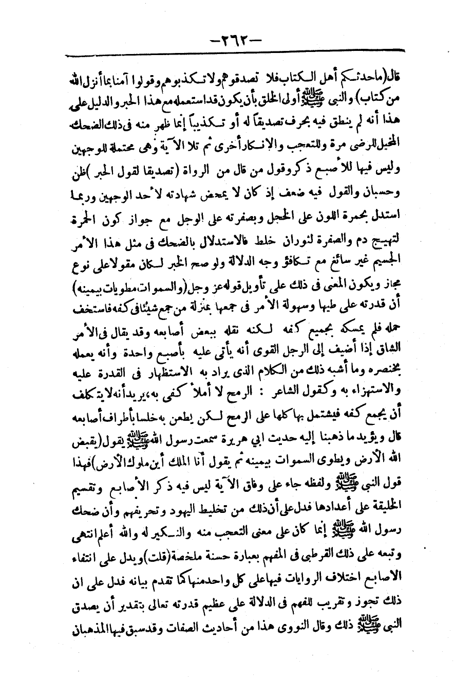 وَتَبِعَهُ عَلَى ذَلِكَ الْقُرْطُبِيُّ فِي الْمُفْهِمِ بِعِبَارَةٍ حَسَنَةٍ مُلَخَّصَةٍ (قُلْت) وَيَدُلُّ عَلَى انْتِفَاءِ الْأَصَابِعِ اخْتِلَافُ الرِّوَايَاتِ فِيهَا عَلَى كُلِّ وَاحِدٍ مِنْهَا كَمَا تَقَدَّمَ بَيَانُهُ فَدَلَّ عَلَى أَنَّ ذَلِكَ تَجَوُّزٍ وَتَقْرِيبٍ لِلْفَهْمِ فِي الدَّلَالَةِ عَلَى عَظِيمِ قُدْرَتِهِ تَعَالَى بِتَقْدِيرِ أَنْ يُصَدِّقَ النَّبِيُّ - صَلَّى اللَّهُ عَلَيْهِ وَسَلَّمَ - ذَلِكَ وَقَالَ النَّوَوِيُّ هَذَا مِنْ أَحَادِيثِ الصِّفَاتِ، وَقَدْ سَبَقَ فِيهَا الْمَذْهَبَانِ