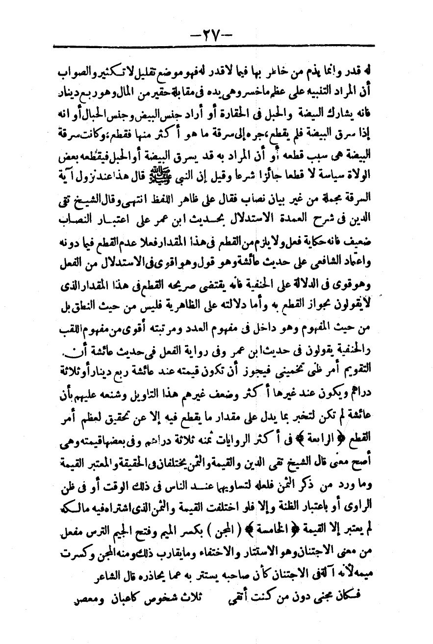 ـــــــــــــــــــــــــــــQلَهُ قَدْرٌ وَإِنَّمَا يُذَمُّ مَنْ خَاطَرَ بِهَا فِيمَا لَا قَدْرَ لَهُ فَهُوَ مَوْضِعُ تَقْلِيلٍ لَا تَكْثِيرٍ وَالصَّوَابُ أَنَّ الْمُرَادَ التَّنْبِيهُ عَلَى عِظَمِ مَا خَسِرَ وَهِيَ يَدُهُ فِي مُقَابَلَةِ حَقِيرٍ مِنْ الْمَالِ وَهُوَ رُبُعُ دِينَارٍ فَإِنَّهُ يُشَارِكُ الْبَيْضَةَ وَالْحَبْلَ فِي الْحَقَارَةِ أَوْ أَرَادَ جِنْسَ الْبَيْضِ وَجِنْسَ الْحِبَالِ أَوْ أَنَّهُ إذَا سَرَقَ الْبَيْضَةَ فَلَمْ يُقْطَعْ، جَرَّهُ إلَى سَرِقَةِ مَا هُوَ أَكْثَرُ مِنْهَا فَقُطِعَ، وَكَانَتْ سَرِقَةُ الْبَيْضَةِ هِيَ سَبَبُ قَطْعِهِ أَوْ أَنَّ الْمُرَادَ بِهِ قَدْ يَسْرِقُ الْبَيْضَةَ أَوْ الْحَبْلَ فَيَقْطَعُهُ بَعْضُ الْوُلَاةِ سِيَاسَةً لَا قَطْعًا جَائِزًا شَرْعًا وَقِيلَ إنَّ النَّبِيَّ - صَلَّى اللَّهُ عَلَيْهِ وَسَلَّمَ - قَالَ هَذَا عِنْدَ نُزُولِ آيَةِ السَّرِقَةِ مُجْمَلَةً مِنْ غَيْرِ بَيَانِ نِصَابٍ فَقَالَ عَلَى ظَاهِرِ اللَّفْظِ انْتَهَى. وَقَالَ الشَّيْخُ تَقِيُّ الدِّينِ فِي شَرْحِ الْعُمْدَةِ الِاسْتِدْلَال بِحَدِيثِ ابْنِ عُمَرَ عَلَى اعْتِبَارِ النِّصَابِ ضَعِيفٌ فَإِنَّهُ حِكَايَةُ فِعْلٍ وَلَا يَلْزَمُ مِنْ الْقَطْعِ فِي هَذَا الْمِقْدَارِ فِعْلًا عَدَمُ الْقَطْعُ فِيمَا دُونَهُ وَاعْتِمَادُ الشَّافِعِيِّ عَلَى حَدِيثِ عَائِشَةَ وَهُوَ قَوْلٌ وَهُوَ أَقْوَى فِي الِاسْتِدْلَالِ مِنْ الْفِعْلِ وَهُوَ قَوِيٌّ فِي الدَّلَالَةِ عَلَى الْحَنَفِيَّةِ فَإِنَّهُ يَقْتَضِي صَرِيحُهُ الْقَطْعَ فِي هَذَا الْمِقْدَارِ الَّذِي لَا يَقُولُونَ بِجَوَازِ الْقَطْعِ بِهِ.