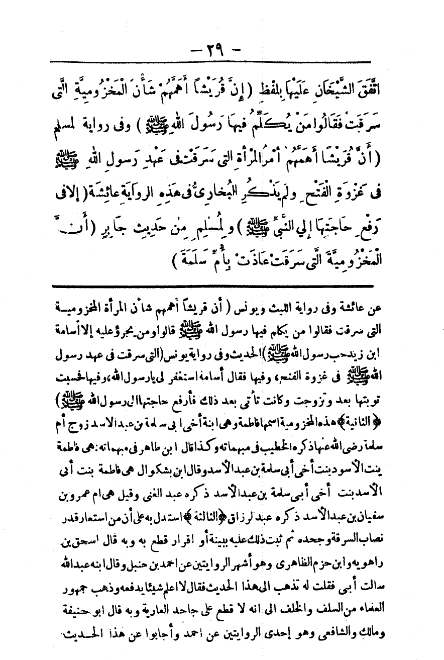 وَقَدْ اتَّفَقَ الشَّيْخَانِ عَلَيْهَا بِلَفْظِ «إنَّ قُرَيْشًا أَهَمَّهُمْ شَأْنُ الْمَخْزُومِيَّةِ الَّتِي سَرَقَتْ فَقَالُوا مَنْ يُكَلِّمُ فِيهَا رَسُولَ اللَّهِ - صَلَّى اللَّهُ عَلَيْهِ وَسَلَّمَ -:» وَفِي رِوَايَةِ مُسْلِمٍ «أَنَّ قُرَيْشًا أَهَمَّهُمْ أَمْرَ الْمَرْأَةِ الَّتِي سَرَقَتْ فِي عَهْدِ رَسُولِ اللَّهِ - صَلَّى اللَّهُ عَلَيْهِ وَسَلَّمَ - فِي غَزْوَةِ الْفَتْحِ» وَلَمْ يَذْكُرْ الْبُخَارِيُّ فِي هَذِهِ الرِّوَايَةِ عَائِشَةَ «إلَّا فِي رَفْعِ حَاجَتِهَا إلَى النَّبِيِّ - صَلَّى اللَّهُ عَلَيْهِ وَسَلَّمَ -:» وَلِمُسْلِمٍ مِنْ حَدِيثِ جَابِرٍ «أَنَّ الْمَخْزُومِيَّةَ الَّتِي سَرَقَتْ عَاذَتْ بِأُمِّ سَلَمَةَ:» ..