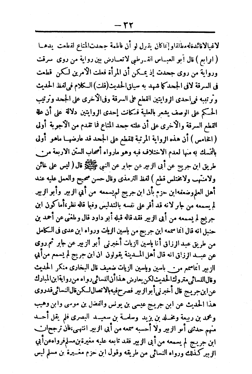 (الْخَامِسُ) : أَنَّ هَذِهِ الرِّوَايَةَ الْمُرَتِّبَةُ لِلْقَطْعِ عَلَى الْجَحْدِ قَدْ عَارَضَهَا مَا هُوَ أَوْلَى بِالتَّمَسُّكِ بِهِ مِنْهَا لِعَدَمِ الِاخْتِلَافِ فِيهِ، وَهُوَ مَا رَوَاهُ أَصْحَابُ السُّنَنِ الْأَرْبَعَةِ مِنْ طَرِيقِ ابْنِ جُرَيْجٍ عَنْ أَبِي الزُّبَيْرِ عَنْ جَابِرٍ عَنْ النَّبِيِّ - صَلَّى اللَّهُ عَلَيْهِ وَسَلَّمَ - قَالَ «لَيْسَ عَلَى خَائِنٍ وَلَا مُنْتَهِبٍ وَلَا مُخْتَلِسٍ قَطْعٌ:» لَفْظُ التِّرْمِذِيِّ وَقَالَ حَسَنٌ صَحِيحٌ وَالْعَمَلُ عَلَيْهِ عِنْدَ أَهْلِ الْعِلْم وَضَعَّفَهُ ابْنُ حَزْمٍ بِأَنَّ ابْنَ جُرَيْجٍ لَمْ يَسْمَعْهُ مِنْ أَبِي الزُّبَيْرِ وَأَبُو الزُّبَيْرِ لَمْ يَسْمَعْهُ مِنْ جَابِرٍ؛ لِأَنَّهُ قَدْ أَقَرَّ عَلَى نَفْسِهِ بِالتَّدْلِيسِ وَفِيمَا قَالَهُ نَظَرٌ، أَمَّا كَوْنُ ابْنِ جُرَيْجٍ لَمْ يَسْمَعْهُ مِنْ أَبِي الزُّبَيْرِ فَقَدْ قَالَهُ قَبْلَهُ أَبُو دَاوُد قَالَ وَبَلَغَنِي عَنْ أَحْمَدَ بْنِ حَنْبَلٍ أَنَّهُ قَالَ إنَّمَا سَمِعَهُ ابْنُ جُرَيْجٍ مِنْ يَاسِينَ الزَّيَّاتِ وَرَوَاهُ ابْنُ عَدِيٍّ فِي الْكَامِلِ مِنْ طَرِيق عَبْدِ الرَّزَّاقِ أَنَا يَاسِينُ الزَّيَّاتُ أَخْبَرَنِي أَبُو الزُّبَيْرِ عَنْ جَابِرٍ ثُمَّ رَوَى عَنْ عَبْدِ الرَّزَّاقِ أَنَّهُ قَالَ أَهْلُ الْمَدِينَةِ يَقُولُونَ: إنَّ ابْنَ جُرَيْجٍ لَمْ يَسْمَعْ مِنْ أَبِي الزُّبَيْرِ إنَّمَا سَمِعَ مِنْ يَاسِينَ وَيَاسِينُ الزَّيَّاتُ ضَعِيفٌ قَالَ الْبُخَارِيُّ مُنْكَرُ الْحَدِيثِ وَقَالَ النَّسَائِيُّ مَتْرُوكُ الْحَدِيثِ لَكِنْ يُعَارِضُ هَذَا أَنَّ النَّسَائِيَّ رَوَاهُ مِنْ رِوَايَةِ ابْنِ الْمُبَارَكِ عَنْ ابْنِ جُرَيْجٍ قَالَ أَخْبَرَنِي أَبُو الزُّبَيْرِ فَصَرَّحَ فِيهِ بِالِاتِّصَالِ لَكِنْ قَالَ النَّسَائِيُّ قَدْ رُوِيَ هَذَا الْحَدِيثُ عَنْ ابْنِ جُرَيْجٍ عِيسَى بْنُ يُونُسَ وَالْفَضْلُ بْنُ مُوسَى وَابْنُ وُهَيْبٍ وَمُحَمَّدُ بْنُ رَبِيعَةَ وَمَخْلَدُ بْنُ يَزِيدَ وَسَلَمَةُ بْنُ سَعِيدٍ الْبَصْرِيُّ فَلَمْ يَقُلْ أَحَدٌ مِنْهُمْ حَدَّثَنِي أَبُو الزُّبَيْرِ وَلَا أَحْسَبُهُ سَمِعَهُ مِنْ أَبِي الزُّبَيْرِ انْتَهَى. فَإِنَّ تَرَجَّحَ أَنَّ ابْنَ جُرَيْجٍ لَمْ يَسْمَعْهُ مِنْ أَبِي الزُّبَيْرِ فَقَدْ تَابَعَهُ عَلَيْهِ مُغِيرَةُ بْنُ مُسْلِمٍ فَرَوَاهُ عَنْ أَبِي الزُّبَيْرِ كَذَلِكَ وَرَوَاهُ النَّسَائِيُّ مِنْ طَرِيقِهِ وَقَوْلُ ابْنُ حَزْمٍ مُغِيرَةُ بْنُ مُسْلِمٍ لَيْسَ.