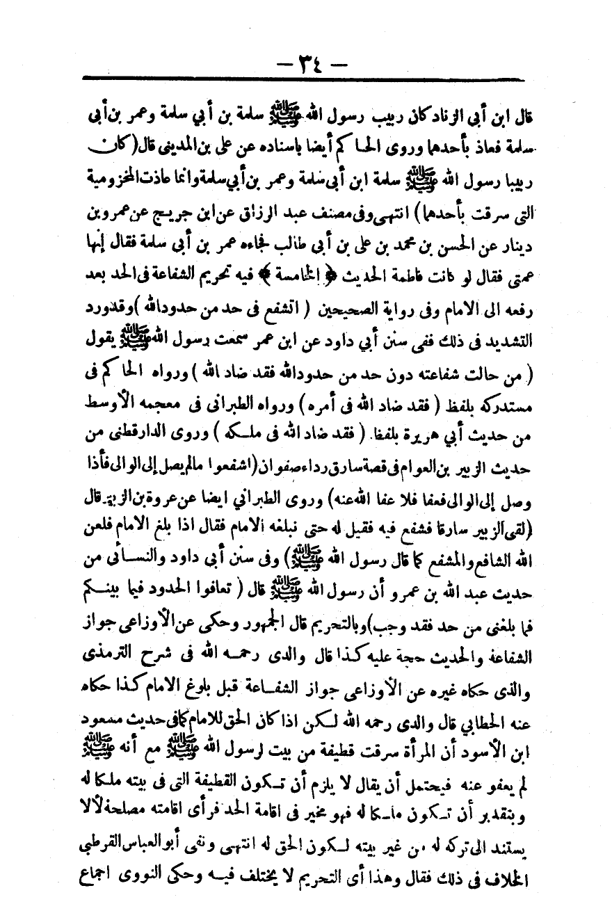 وَرَوَى الدَّارَقُطْنِيُّ مِنْ حَدِيثِ الزُّبَيْرِ بْنِ الْعَوَّامِ فِي قِصَّةِ سَارِقِ رِدَاءِ صَفْوَانَ «اشْفَعُوا مَا لَمْ يَصِلْ إلَى الْوَالِي فَإِذَا وَصَلَ إلَى الْوَالِي فَعَفَا فَلَا عَفَا اللَّهُ عَنْهُ» وَرَوَى الطَّبَرَانِيُّ أَيْضًا عَنْ عُرْوَةَ بْنِ الزُّبَيْرِ قَالَ «لَقِيَ الزُّبَيْرُ سَارِقًا فَشَفَعَ فِيهِ فَقِيلَ لَهُ حَتَّى نُبَلِّغَهُ الْإِمَامَ فَقَالَ إذَا بَلَغَ الْإِمَامَ فَلَعَنَ اللَّهُ الشَّافِعَ وَالْمُشَفَّعَ كَمَا قَالَ رَسُولُ اللَّهِ - صَلَّى اللَّهُ عَلَيْهِ وَسَلَّمَ -:» وَفِي سُنَنِ أَبِي دَاوُد وَالنَّسَائِيُّ مِنْ حَدِيثِ عَبْدِ اللَّهِ بْنِ عَمْرٍو أَنَّ رَسُولَ اللَّهِ - صَلَّى اللَّهُ عَلَيْهِ وَسَلَّمَ - قَالَ «تَعَافُوا الْحُدُودَ فِيمَا بَيْنَكُمْ فَمَا بَلَغَنِي مِنْ حَدٍّ فَقَدْ وَجَبَ:» وَبِالتَّحْرِيمِ قَالَ الْجُمْهُورُ وَحُكِيَ عَنْ الْأَوْزَاعِيِّ جَوَازُ الشَّفَاعَةِ وَالْحَدِيثُ حُجَّةٌ عَلَيْهِ كَذَا قَالَ وَالِدِي - رَحِمَهُ اللَّهُ - فِي شَرْحِ التِّرْمِذِيِّ وَاَلَّذِي حَكَاه غَيْرُهُ عَنْ الْأَوْزَاعِيِّ جَوَازُ الشَّفَاعَةِ قَبْلَ بُلُوغِ الْإِمَامِ كَذَا حَكَاه عَنْهُ الْخَطَّابِيُّ قَالَ وَالِدِي - رَحِمَهُ اللَّهُ - لَكِنْ إذَا كَانَ الْحَقُّ لِلْإِمَامِ كَمَا فِي حَدِيثِ مَسْعُودِ بْنِ الْأَسْوَدِ أَنَّ «الْمَرْأَةَ سَرَقَتْ قَطِيفَةً مِنْ بَيْتِ رَسُولِ اللَّهِ - صَلَّى اللَّهُ عَلَيْهِ وَسَلَّمَ -» مَعَ أَنَّهُ - صَلَّى اللَّهُ عَلَيْهِ وَسَلَّمَ - لَمْ يَعْفُ عَنْهُ فَيُحْتَمَلُ أَنْ يُقَالَ لَا يَلْزَمُ أَنْ تَكُونَ الْقَطِيفَةُ الَّتِي فِي بَيْتِهِ مِلْكًا لَهُ وَبِتَقْدِيرِ أَنْ تَكُونَ مِلْكًا لَهُ فَهُوَ مُخَيَّرٌ فِي إقَامَةِ الْحَدِّ فَرَأَى إقَامَتَهُ مَصْلَحَةً؛ لِئَلَّا يَسْتَنِدَ إلَى تَرْكِهِ لَهُ مِنْ غَيْرِ بَيْتِهِ لِكَوْنِ الْحَقِّ لَهُ انْتَهَى.