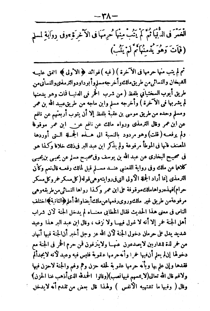 فِي الدُّنْيَا ثُمَّ لَمْ يَتُبْ مِنْهَا حُرِمَهَا فِي الْآخِرَةِ» وَفِي رِوَايَةٍ لِمُسْلِمٍ «فَمَاتَ وَهُوَ يُدْمِنُهَا ثُمَّ لَمْ يَتُبْ:» ..