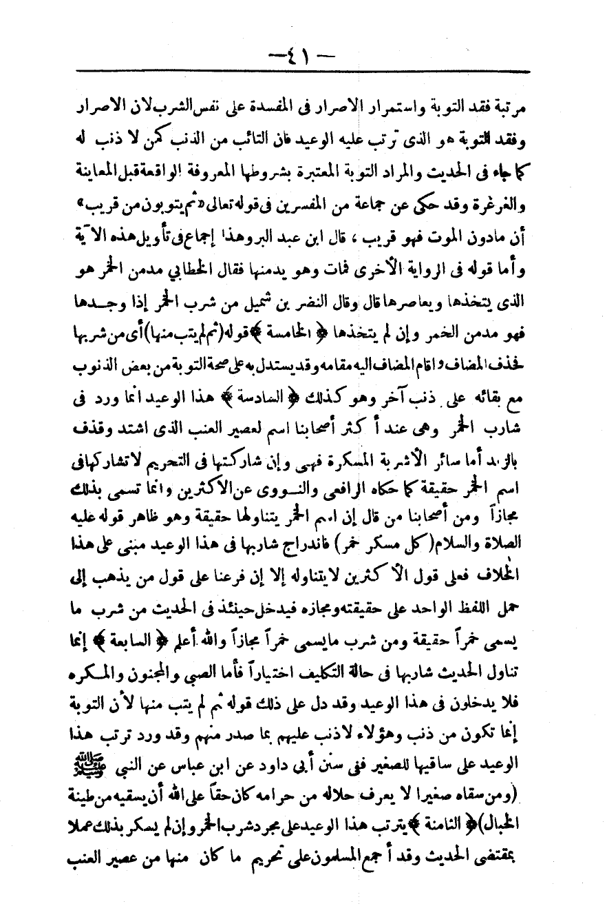 ـــــــــــــــــــــــــــــQمَرْتَبَةِ فَقْدِ التَّوْبَةِ وَاسْتِمْرَارِ الْإِصْرَارِ فِي الْمَفْسَدَةِ عَلَى نَفْسِ الشُّرْبِ؛ لِأَنَّ الْإِصْرَارَ وَفَقْدَ التَّوْبَةِ هُوَ الَّذِي تَرَتَّبَ عَلَيْهِ الْوَعِيدُ فَإِنَّ «التَّائِبَ مِنْ الذَّنْبِ كَمَنْ لَا ذَنْبَ» لَهُ كَمَا جَاءَ فِي الْحَدِيثِ وَالْمُرَادُ التَّوْبَةُ الْمُعْتَبَرَةُ بِشُرُوطِهَا الْمَعْرُوفَةِ الْوَاقِعَةِ قَبْلَ الْمُعَايَنَةِ وَالْغَرْغَرَةِ وَقَدْ حُكِيَ عَنْ جَمَاعَةٍ مِنْ الْمُفَسِّرِينَ فِي قَوْله تَعَالَى {ثُمَّ يَتُوبُونَ مِنْ قَرِيبٍ} [النساء: 17] أَنَّ مَا دُونَ الْمَوْتِ فَهُوَ قَرِيبٌ.