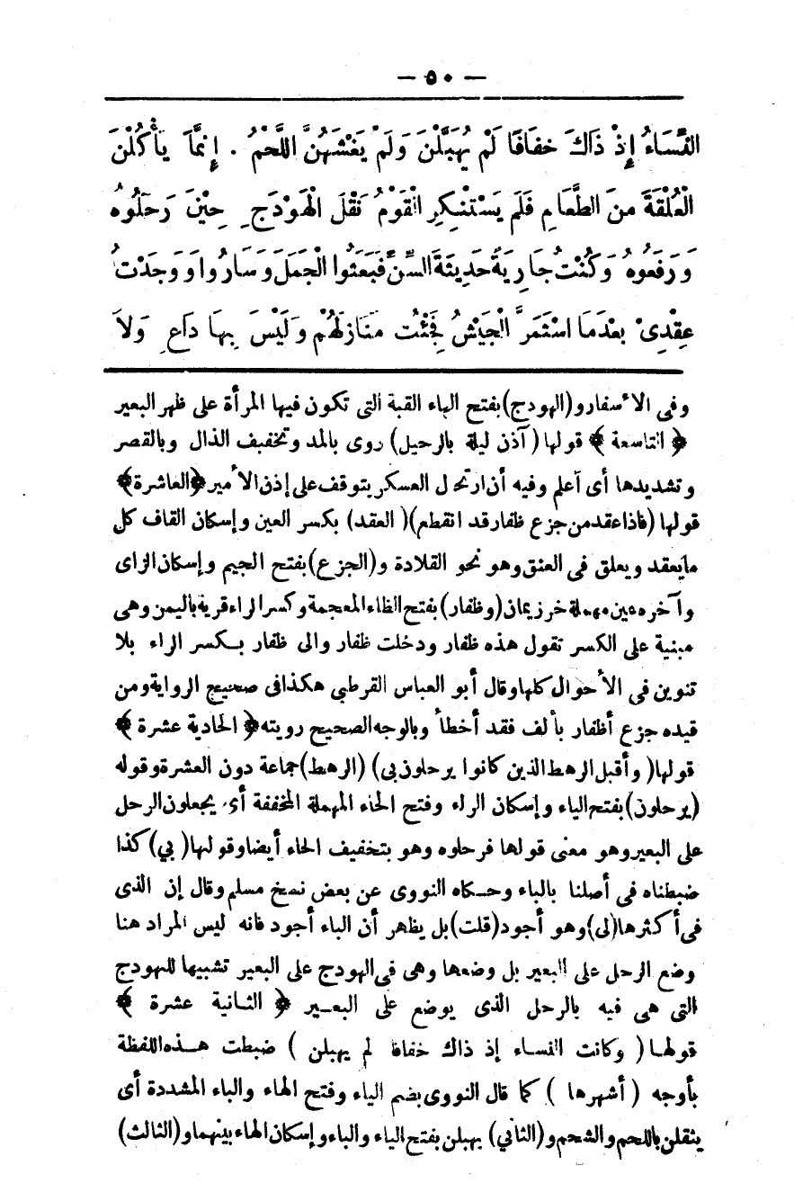 (الثَّانِيَةَ عَشْرَةَ) : قَوْلُهَا «وَكَانَتْ النِّسَاءُ إذْ ذَاكَ خِفَافًا لَا يَهْبُلْنَ:» ضُبِطَتْ هَذِهِ اللَّفْظَةُ بِأَوْجُهٍ (أَشْهُرُهَا) : كَمَا قَالَ النَّوَوِيُّ بِضَمِّ الْيَاءِ وَفَتْحِ الْهَاءِ وَالْبَاءِ الْمُشَدَّدَةِ أَيْ يُثْقَلْنَ بِاللَّحْمِ وَالشَّحْمِ (وَالثَّانِي) : يَهْبَلْنَ بِفَتْحِ الْيَاءِ وَالْبَاءِ وَإِسْكَانِ الْهَاءِ بَيْنَهُمَا.