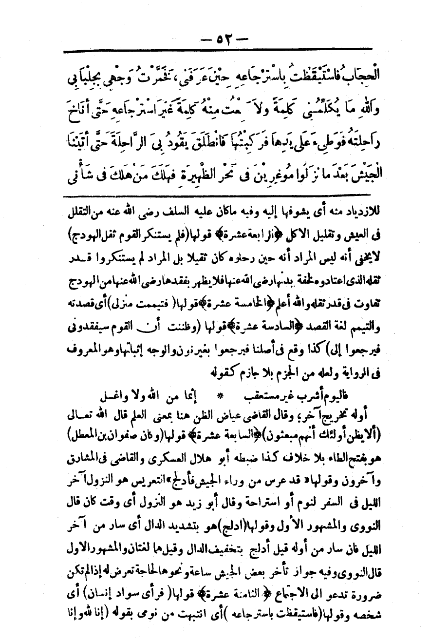 الْحِجَابُ فَاسْتَيْقَظْت بِاسْتِرْجَاعِهِ حِينَ عَرَفَنِي، فَخَمَّرْت وَجْهِي بِجِلْبَابِي وَاَللَّهِ مَا يُكَلِّمُنِي كَلِمَةً وَلَا سَمِعْت مِنْهُ كَلِمَةً غَيْرَ اسْتِرْجَاعِهِ حَتَّى أَنَاخَ رَاحِلَتَهُ فَوَطِئَ عَلَى يَدِهَا فَرَكِبْتهَا فَانْطَلَقَ يَقُودُ بِي الرَّاحِلَةَ حَتَّى أَتَيْنَا الْجَيْشَ بَعْدَ مَا نَزَلُوا مُوغِرِينَ فِي نَحْرِ الظَّهِيرَةِ فَهَلَكَ مَنْ هَلَكَ فِي شَأْنِي