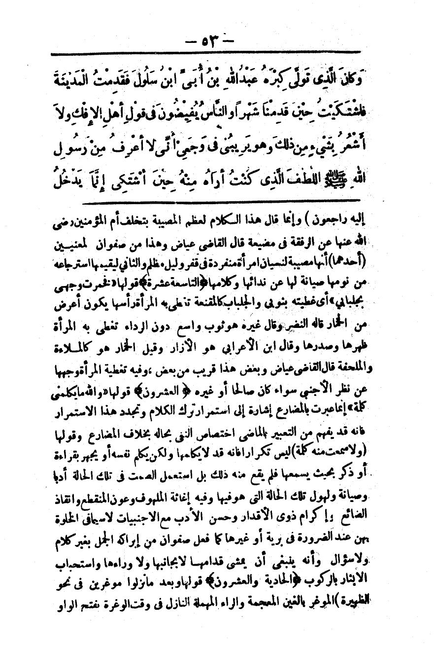 وَكَانَ الَّذِي تَوَلَّى كِبْرَهُ عَبْدُ اللَّهِ بْنُ أُبَيٍّ ابْنِ سَلُولَ فَقَدِمْت الْمَدِينَةَ فَاشْتَكَيْت حِينَ قَدِمْنَا شَهْرًا وَالنَّاسُ يُفِيضُونَ فِي قَوْلِ أَهْلِ الْإِفْكِ وَلَا أَشْعُرُ بِشَيْءٍ مِنْ ذَلِكَ وَهُوَ يَرِيبُنِي فِي وَجَعِي أَنِّي لَا أَعْرِفُ مِنْ رَسُولِ اللَّهِ - صَلَّى اللَّهُ عَلَيْهِ وَسَلَّمَ - اللُّطْفَ الَّذِي كُنْت أَرَاهُ مِنْهُ حِينَ أَشْتَكِي إنَّمَا يَدْخُلُ