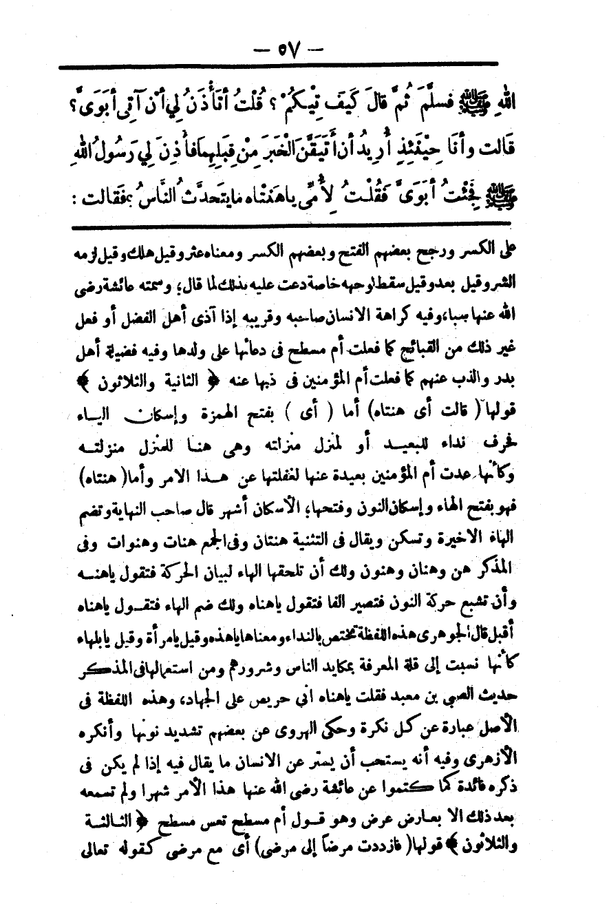 اللَّهِ - صَلَّى اللَّهُ عَلَيْهِ وَسَلَّمَ - فَسَلَّمَ ثُمَّ قَالَ كَيْفَ تِيكُمْ؟ قُلْت أَتَأْذَنُ لِي أَنْ آتِي أَبَوَيَّ؟ قَالَتْ وَأَنَا حِينَئِذٍ أُرِيدُ أَنْ أَتَيَقَّنَ الْخَبَرَ مِنْ قِبَلِهِمَا فَأَذِنَ لِي رَسُولُ اللَّهِ - صَلَّى اللَّهُ عَلَيْهِ وَسَلَّمَ - فَجِئْت أَبَوَيَّ فَقُلْت لِأُمِّي يَا هَنْتَاه مَا يَتَحَدَّثُ النَّاسُ؟ فَقَالَتْ: