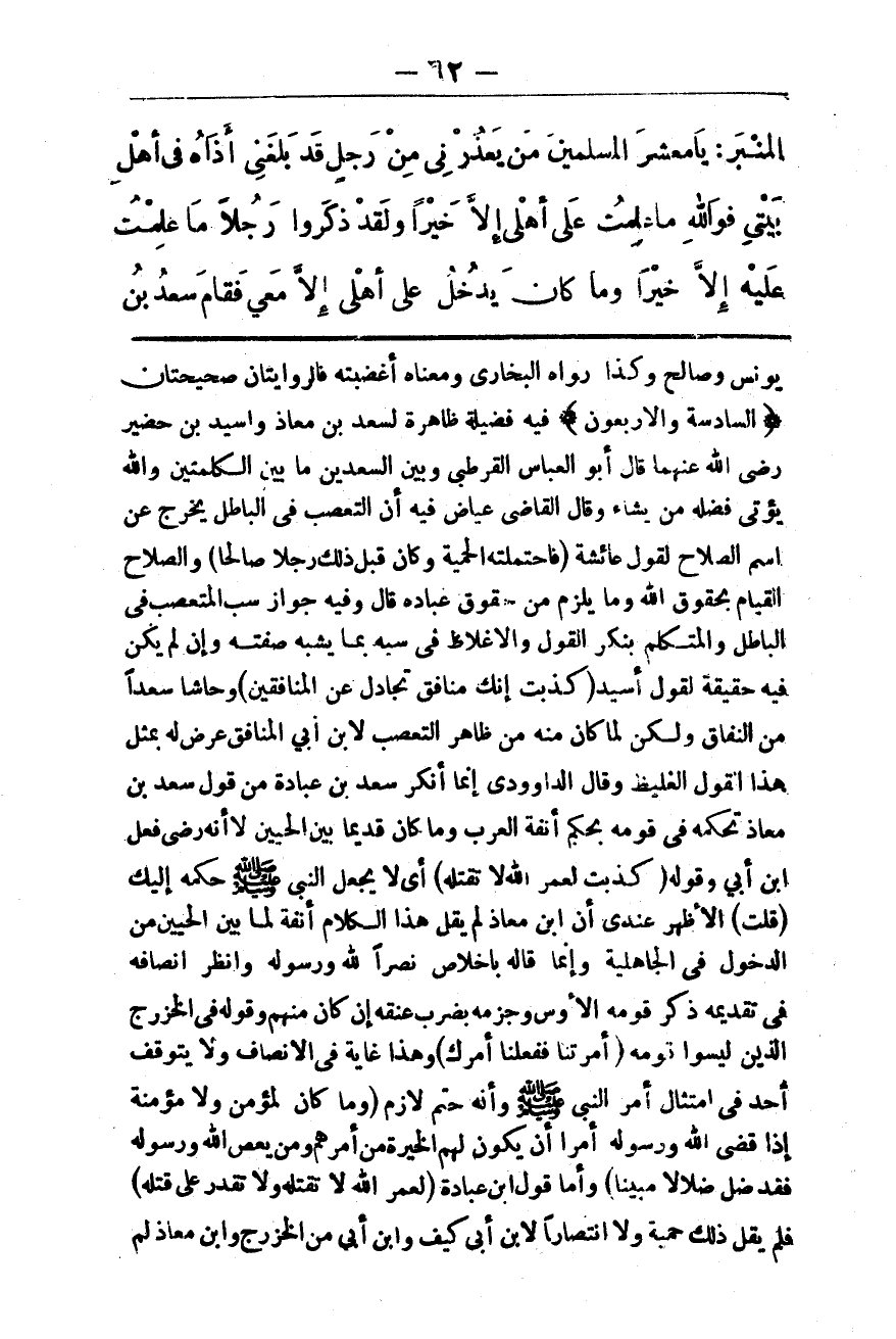 الْمِنْبَرِ: يَا مَعْشَرَ الْمُسْلِمِينَ مَنْ يَعْذُرُنِي مِنْ رَجُلٍ قَدْ بَلَغَنِي أَذَاهُ فِي أَهْلِ بَيْتِي فَوَاَللَّهِ مَا عَلِمْت عَلَى أَهْلِي إلَّا خَيْرًا وَلَقَدْ ذَكَرُوا رَجُلًا مَا عَلِمْت عَلَيْهِ إلَّا خَيْرًا وَمَا كَانَ يَدْخُلُ عَلَى أَهْلِي إلَّا مَعِي فَقَامَ سَعْدُ بْنُ مُعَاذٍ الْأَنْصَارِيُّ