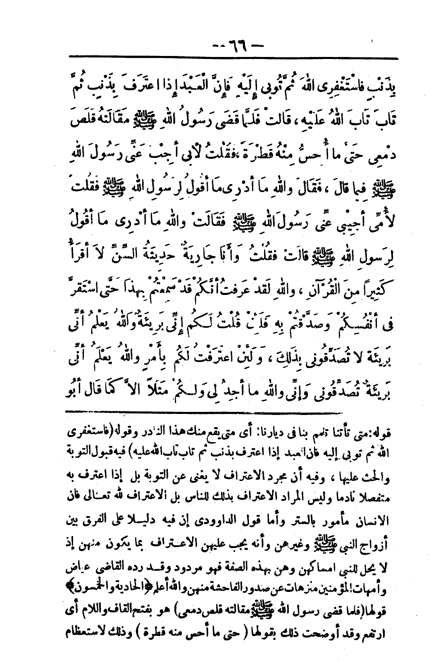 بِذَنْبٍ فَاسْتَغْفِرِي اللَّهَ ثُمَّ تُوبِي إلَيْهِ، فَإِنَّ الْعَبْدَ إذَا اعْتَرَفَ بِذَنْبٍ ثُمَّ تَابَ تَابَ اللَّهُ عَلَيْهِ، قَالَتْ فَلَمَّا قَضَى رَسُولُ اللَّهِ - صَلَّى اللَّهُ عَلَيْهِ وَسَلَّمَ - مَقَالَتَهُ قَلَصَ دَمْعِي حَتَّى مَا أُحِسُّ مِنْهُ قَطْرَةً، فَقُلْت لِأَبِي أَجِبْ عَنِّي رَسُولَ اللَّهِ - صَلَّى اللَّهُ عَلَيْهِ وَسَلَّمَ - فِيمَا قَالَ، فَقَالَ وَاَللَّهِ مَا أَدْرِي مَا أَقُولُ لِرَسُولِ اللَّهِ - صَلَّى اللَّهُ عَلَيْهِ وَسَلَّمَ - فَقُلْت لِأُمِّي أَجِيبِي عَنِّي رَسُولَ اللَّهِ - صَلَّى اللَّهُ عَلَيْهِ وَسَلَّمَ - فَقَالَتْ وَاَللَّهِ مَا أَدْرِي مَا أَقُولُ لِرَسُولِ اللَّهِ - صَلَّى اللَّهُ عَلَيْهِ وَسَلَّمَ - قَالَتْ فَقُلْت وَأَنَا جَارِيَةٌ حَدِيثَةُ السِّنِّ لَا أَقْرَأُ كَثِيرًا مِنْ الْقُرْآنِ، وَاَللَّهِ لَقَدْ عَرَفْت أَنَّكُمْ قَدْ سَمِعْتُمْ بِهَذَا حَتَّى اسْتَقَرَّ فِي أَنْفُسِكُمْ وَصَدَّقْتُمْ بِهِ، فَإِنْ قُلْت لَكُمْ أَنِّي بَرِيئَةٌ وَاَللَّهُ يَعْلَمُ أَنِّي بَرِيئَةٌ لَا تُصَدِّقُونِي بِذَلِكَ، وَلَئِنْ اعْتَرَفْت لَكُمْ بِأَمْرٍ وَاَللَّهُ يَعْلَمُ أَنِّي بَرِيئَةٌ تُصَدِّقُونِي وَإِنِّي وَاَللَّهِ مَا أَجِدُ لِي وَلَكُمْ مَثَلًا إلَّا كَمَا قَالَ أَبُو يُوسُفَ