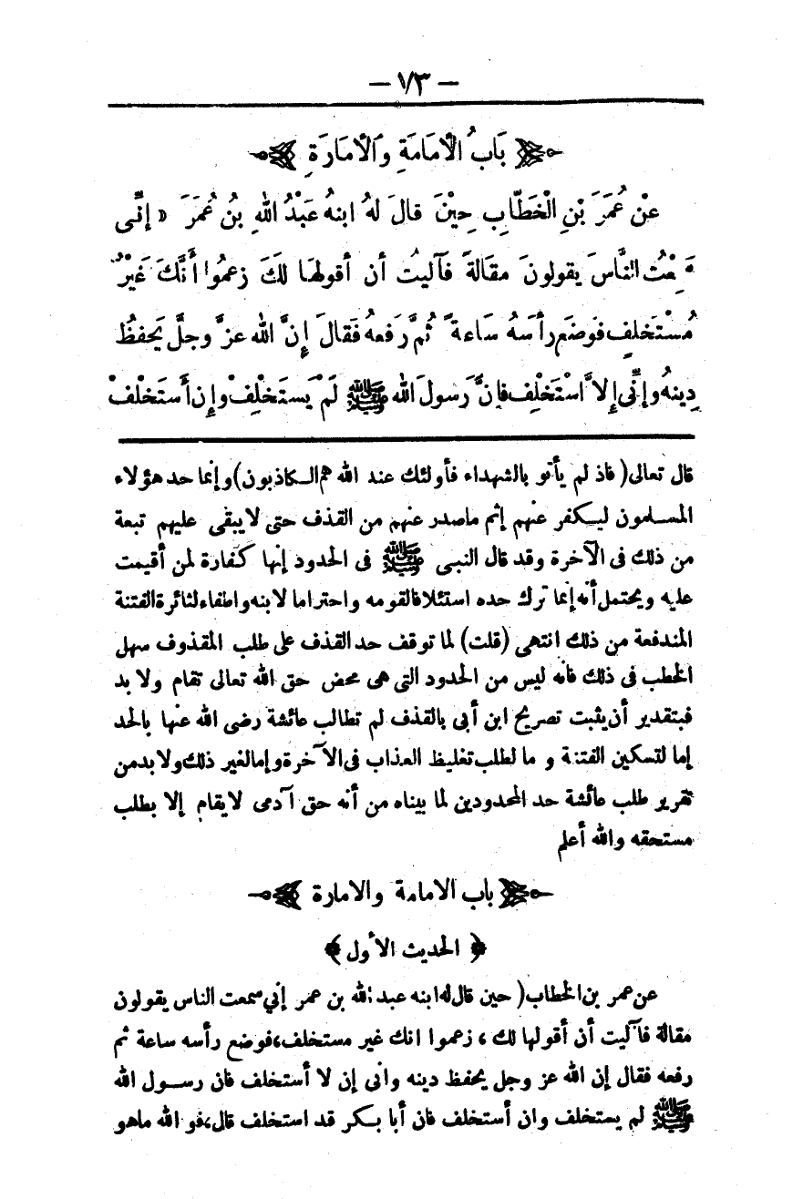 بَابُ الْإِمَامَةِ وَالْإِمَارَةِ عَنْ «عُمَرَ بْنِ الْخَطَّابِ حِينَ قَالَ لَهُ ابْنُهُ عَبْدُ اللَّهِ بْنُ عُمَرَ إنِّي سَمِعْت النَّاسَ يَقُولُونَ مَقَالَةً فَآلَيْت أَنْ أَقُولَهَا لَك زَعَمُوا أَنَّك غَيْرُ مُسْتَخْلِفٍ فَوَضَعَ رَأْسَهُ سَاعَةً ثُمَّ رَفَعَهُ فَقَالَ إنَّ اللَّهَ عَزَّ وَجَلَّ يَحْفَظُ دِينَهُ وَإِنِّي لَا أَسْتَخْلِفُ، فَإِنَّ رَسُولَ اللَّهِ - صَلَّى اللَّهُ عَلَيْهِ وَسَلَّمَ - لَمْ يَسْتَخْلِفْ، وَإِنْ أَسْتَخْلِفْ