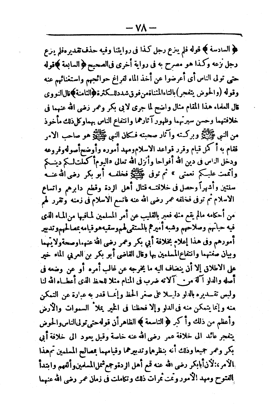 (التَّاسِعَةُ) : الظَّاهِرُ أَنَّ قَوْلَهُ «حَتَّى تَوَلَّى النَّاسُ وَالْحَوْضُ يَتَفَجَّرُ» عَائِدٌ إلَى خِلَافَةِ عُمَرَ - رَضِيَ اللَّهُ عَنْهُ - خَاصَّةَ وَقِيلَ يَعُودُ إلَى خِلَافَةِ أَبِي بَكْرٍ وَعُمَرَ جَمِيعًا وَذَلِكَ أَنَّهُ بِنَظَرِهِمَا وَتَدْبِيرِهِمَا وَقِيَامِهِمَا بِمَصَالِحِ الْمُسْلِمِينَ تَمَّ هَذَا الْأَمْرُ؛ لِأَنَّ أَبَا بَكْرٍ - رَضِيَ اللَّهُ عَنْهُ - قَمَعَ أَهْلَ الرِّدَّةِ وَجَمَعَ شَمْلَ الْمُسْلِمِينَ وَأَلَّفَهُمْ وَابْتَدَأَ الْفُتُوحَ وَمَهَّدَ الْأُمُورَ وَتَمَّتْ ثَمَرَاتُ ذَلِكَ وَتَكَامَلَتْ فِي زَمَانِ عُمَرَ - رَضِيَ اللَّهُ عَنْهُ -.