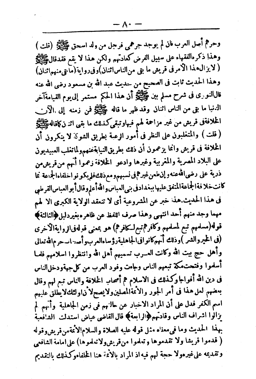 قَالَ النَّوَوِيُّ فِي شَرْحِ مُسْلِمٍ بَيَّنَ - صَلَّى اللَّهُ عَلَيْهِ وَسَلَّمَ - أَنَّ هَذَا الْحُكْمَ مُسْتَمِرٌّ إلَى يَوْمِ الْقِيَامَةِ آخِرَ الدُّنْيَا مَا بَقِيَ مِنْ النَّاسِ اثْنَانِ وَقَدْ ظَهَرَ مَا قَالَهُ - صَلَّى اللَّهُ عَلَيْهِ وَسَلَّمَ - فَمِنْ زَمَنِهِ إلَى الْآنَ الْخِلَافَةُ فِي قُرَيْشٍ مِنْ غَيْرِ مُزَاحِمَةٍ لَهُمْ فِيهَا وَتَبْقَى كَذَلِكَ مَا بَقِيَ اثْنَانِ كَمَا قَالَهُ - صَلَّى اللَّهُ عَلَيْهِ وَسَلَّمَ - (قُلْت) : وَالْمُتَغَلَّبُونَ عَلَى النَّظَرِ فِي أُمُورِ الرَّغْبَةِ بِطَرِيقِ الشَّوْكَةِ لَا يُنْكِرُونَ أَنَّ الْخِلَافَةَ فِي قُرَيْشٍ وَإِنَّمَا يَزْعُمُونَ أَنَّ ذَلِكَ بِطَرِيقِ النِّيَابَةِ عَنْهُمْ وَلَمَّا تَغَلَّبَ الْعُبَيْدِيُّونَ عَلَى الْبِلَادِ الْمِصْرِيَّةِ وَالْمَغْرِبِيَّةِ وَغَيْرِهَا وَادَّعُوا الْخِلَافَةَ زَعَمُوا أَنَّهُمْ مِنْ قُرَيْشٍ مِنْ ذُرِّيَّةِ عَلِيٍّ - رَضِيَ اللَّهُ عَنْهُ -، وَإِنْ طَعَنَ غَيْرُهُمْ فِي نَسَبِهِمْ وَمَعَ ذَلِكَ فَلَمْ يَكُونُوا خُلَفَاءَ الْجَمَاعَةِ فَمَا كَانَتْ خِلَافَةُ الْجَمَاعَةِ الْمُتَّفَقِ عَلَيْهَا بِبَغْدَادَ فِي بَنِي الْعَبَّاسِ وَاَللَّهُ أَعْلَمُ.