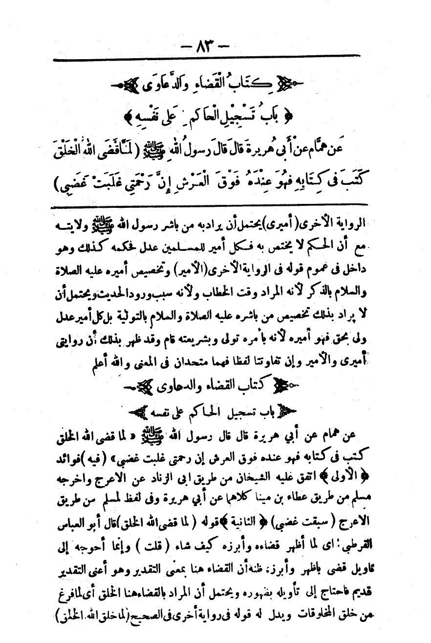 كِتَابُ الْقَضَاءِ وَالدَّعَاوَى بَابُ تَسْجِيلِ الْحَاكِمِ عَلَى نَفْسِهِ عَنْ هَمَّامٍ عَنْ أَبِي هُرَيْرَةَ قَالَ قَالَ رَسُولُ اللَّهِ - صَلَّى اللَّهُ عَلَيْهِ وَسَلَّمَ - «لَمَّا قَضَى اللَّهُ الْخَلْقَ كَتَبَ فِي كِتَابِهِ فَهُوَ عِنْدَهُ فَوْقَ الْعَرْشِ إنَّ رَحْمَتِي غَلَبَتْ غَضَبِي» (فِيهِ) فَوَائِدُ.