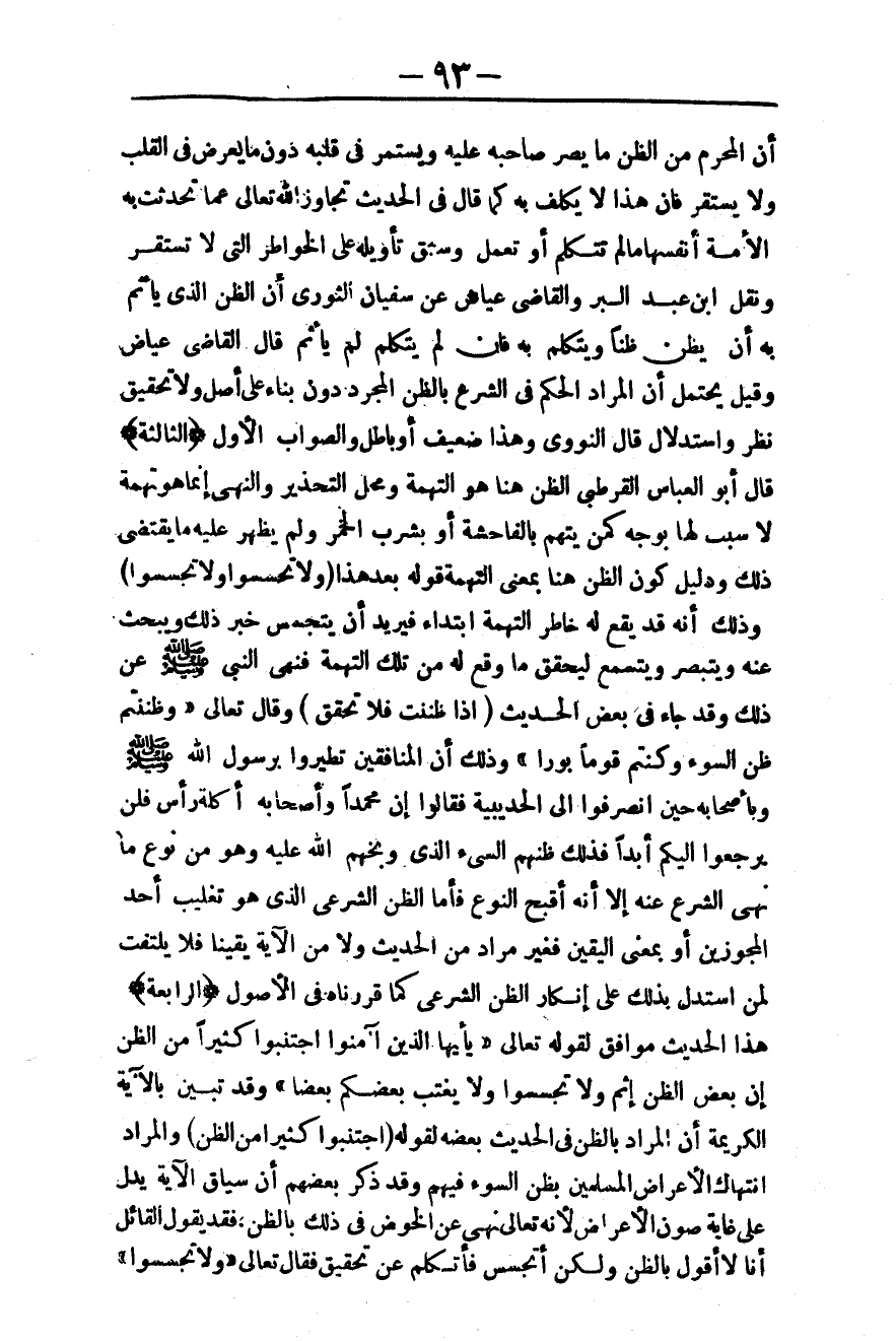ـــــــــــــــــــــــــــــQأَنَّ الْمُحَرَّمَ مِنْ الظَّنِّ مَا يُصِرُّ صَاحِبُهُ عَلَيْهِ وَيَسْتَمِرُّ فِي قَلْبِهِ دُونَ مَا يَعْرِضُ فِي الْقَلْبِ وَلَا يَسْتَقِرُّ فَإِنَّ هَذَا لَا يُكَلَّفُ بِهِ كَمَا قَالَ فِي الْحَدِيثِ «تَجَاوَزَ اللَّهُ تَعَالَى عَمَّا تَحَدَّثَتْ بِهِ الْأُمَّةُ أَنْفُسَهَا مَا لَمْ تَتَكَلَّمْ أَوْ تَعْمَلْ» وَسَبَقَ تَأْوِيلُهُ عَلَى الْخَوَاطِرِ الَّتِي لَا تَسْتَقِرُّ وَنَقَلَ ابْنُ عَبْدِ الْبَرِّ وَالْقَاضِي عِيَاضٌ عَنْ سُفْيَانَ الثَّوْرِيِّ أَنَّ الظَّنَّ الَّذِي يَأْثَمُ بِهِ أَنْ يَظُنَّ ظَنًّا وَيَتَكَلَّمَ بِهِ فَإِنْ لَمْ يَتَكَلَّمْ لَمْ يَأْثَمْ قَالَ الْقَاضِي عِيَاضٌ وَقِيلَ يُحْتَمَلُ أَنَّ الْمُرَادَ الْحُكْمُ فِي الشَّرْعِ بِالظَّنِّ الْمُجَرَّدِ دُونَ بِنَاءٍ عَلَى أَصْلٍ وَلَا تَحْقِيقِ نَظَرٍ وَاسْتِدْلَالٍ قَالَ النَّوَوِيُّ وَهَذَا ضَعِيفٌ أَوْ بَاطِلٌ وَالصَّوَابُ الْأَوَّلُ. .