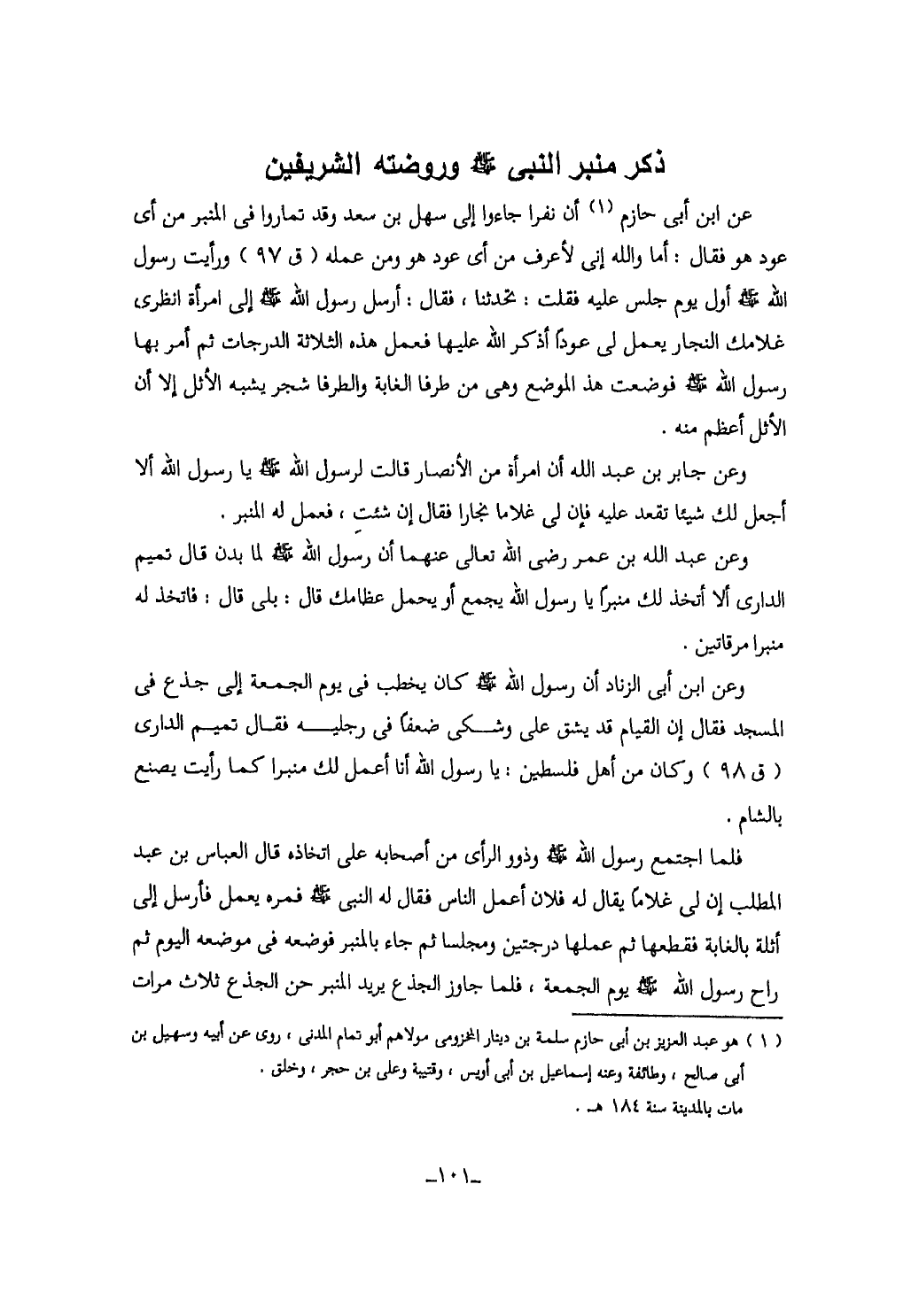 عن ابن أبى حازم (1) أن نفرا جاءوا الى سهل بن سعد وقد تماروا في المنبر من أى عود هو فقال: أما والله انى لأعرف من أى عود هو ومن عمله (ق97) ورأيت رسول الله صلى الله عليه وسلم أول يوم جلس عليه فقلت: تحدثنا، فقال: أرسل رسول الله صلى الله عليه وسلم الى امرأة انظرى غلامك النجار يعمل لى عوداً أذكر الله عليها فعل هذه الثلاثة الدرجات ثم أمر بها رسول الله صلى الله عليه وسلم فوضعت هذ الموضع وهى من طرفا الغابة والطرفا شجر يشبه الأثل الا أن الأثل أعظم منه.
