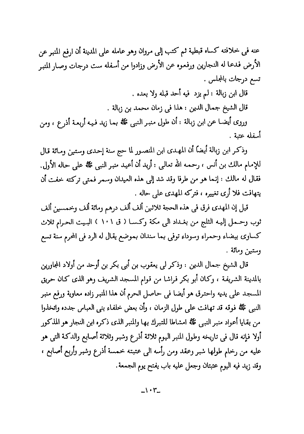 103…عنه في خلافته كساه قبطية ثم كتب الى مروان وهو عامله على المدنية أن ارفع المنبر عن الأرض فدعا له النجارين ورفعوه عن الأرض وزادوا من أسفله ست درجات وصار المنبر تسع درجات بالمجلس.