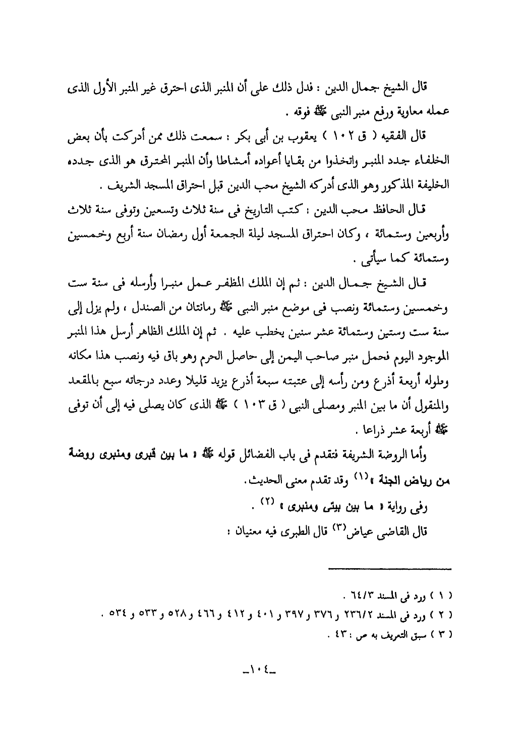 104…قال الشيخ جمال الدين: فدل ذلك على أن المنبر الذى احترق غير المنبر الأول الذى عمله معاوية ورفع منبر النبى صلى الله عليه وسلم فوقه.