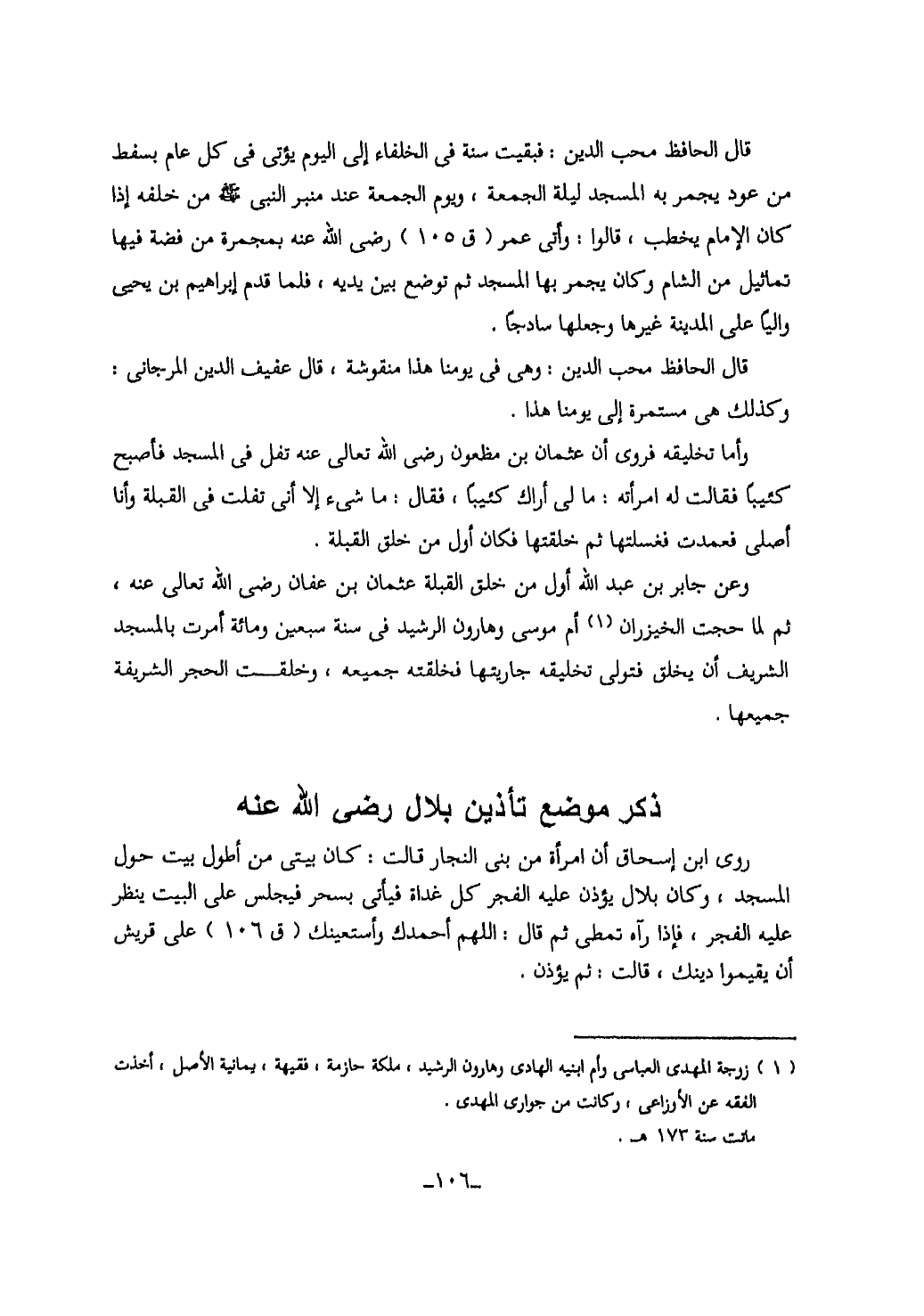 106…قال الحافظ محب الدين: فبقيت سنة في الخلفاء الى يوم يؤتى في كل عام بسفط من عود يجمر به المسجد ليلة الجمعة، ويوم الجمعة عند منبر النبى صلى الله عليه وسلم من خلفه اذا كان الامام يخطب، قالوا: وأتى عمر (ق 105) رضى الله عنه بمجمرة من فضة فيها تماثيل من الشام وكان يجمر بها المسجد ثم توضع بين يديه، فلما قدم ابراهيم بن يحيى والياً على المدينة غيرها وجعلها سادجاً.