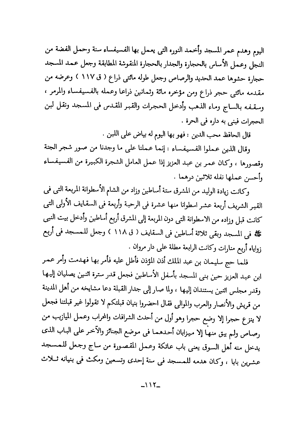 112…اليوم وهدم عمر المسجد وأخمد النوره التى يعمل بها الفسيفساء سنة وحمل الفضة من النجل وعمل الأساس بالحجارة والجدار بالحجارة المنقوشة المطابقة وجعل عمد المسجد حجارة حشوها عمد الحديد والرصاص وجعل طوله مائتى ذراع (ق117) وعرضه من مقدمه مائتى حجر ذراع ومن مؤخره مائة وثمانين ذراعا وعمله بالفسيفساء والمرمر، وسقفه بالساج وماء الذهب وأدخل الحجرات والقبر المقدس في المسجد ونقل لبن الحجرات فبنى به داره في الحرة.
