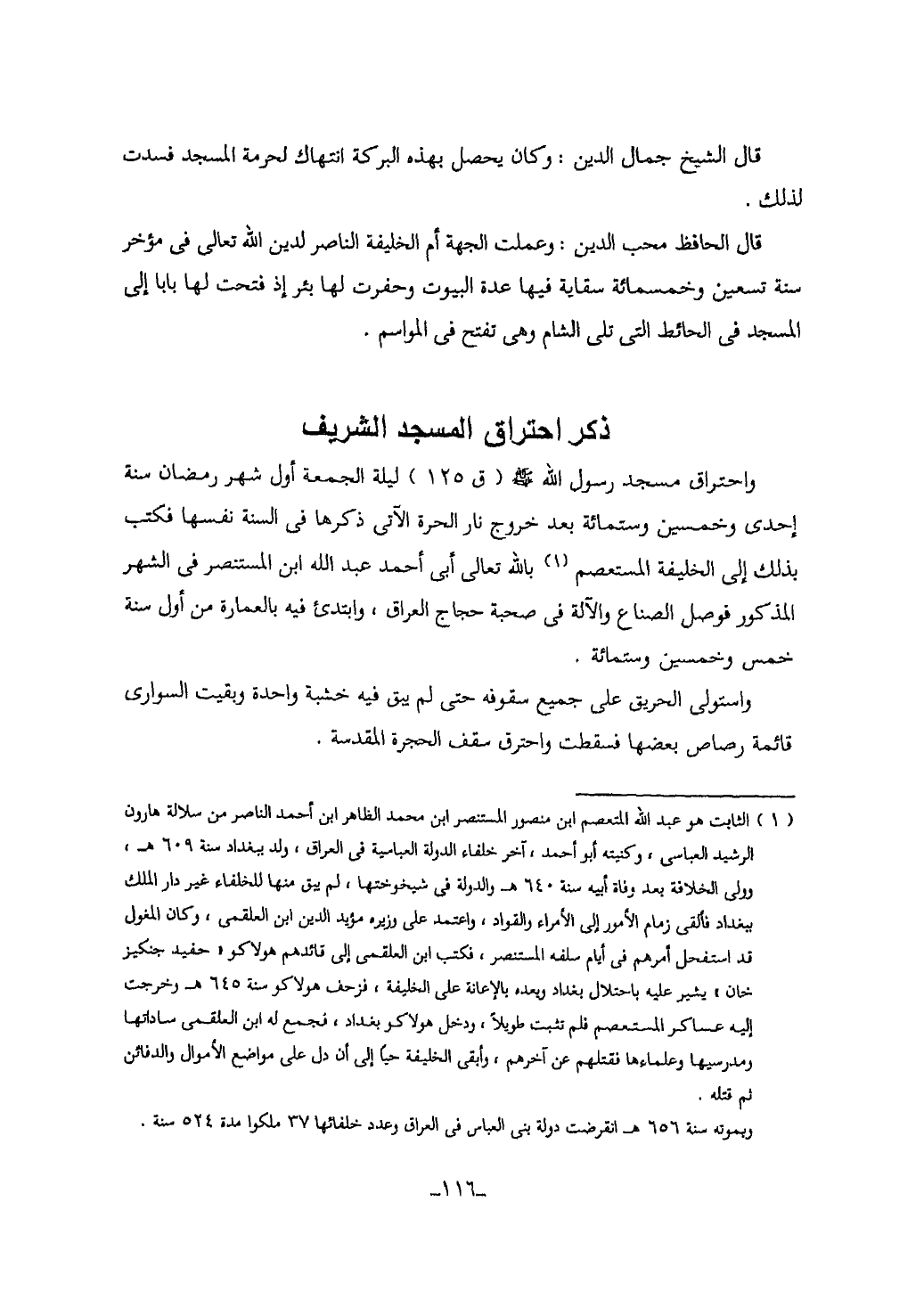 واحتراق مسجد رسول الله صلى الله عليه وسلم (ق125) ليلة الجمعة أول شهر رمضان سنة احدى وخمسين وستمائة بعد خروج نار الحرة الآتى ذكرها في السنة نفسها فكتب بذلك الى الخليفة المستعصم (1) بالله تعالى أبى أحمد عبد الله ابن المستنصر في الشهر المذكور فوصل الصناع والآلة في صحبة حجاج العرق، وابتدئ فيه بالعمارة من أول سنة خمس وخمسين وستمائة.