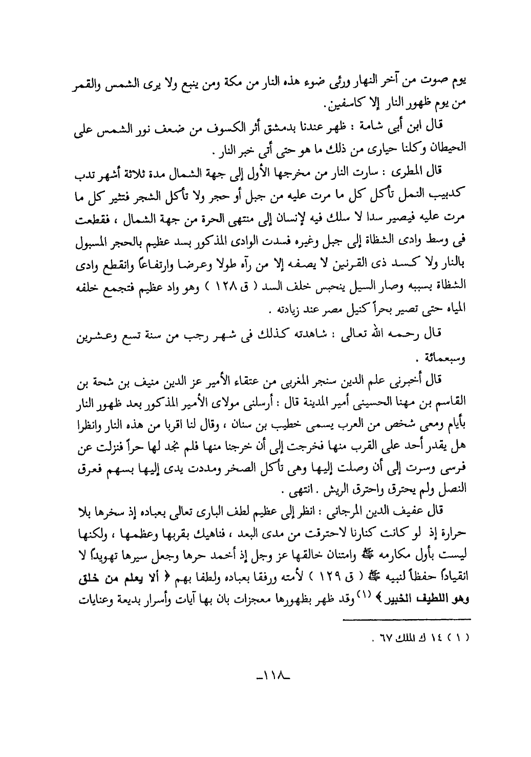 118…يوم صوت من آخر النهار ضوء هذه النار من مكة ومن ينبع ولا يرى الشمس والقمر من يوم ظهور النار الا كاسفين.