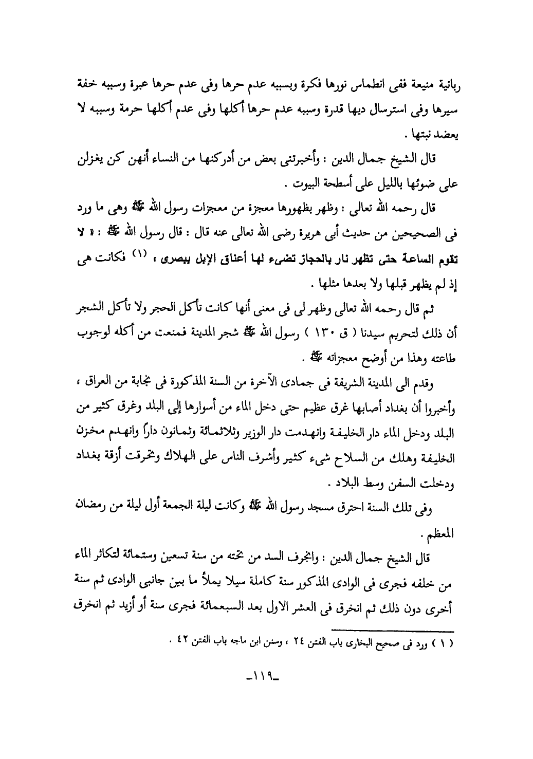 قال رحمه الله تعالى: وظهر بظهورها معجزة من معجزات رسول الله صلى الله عليه وسلم وهى ما ورد في الصحيحين من حديث أبى هريرة رضى الله تعالى عنه قال: قال رسول الله صلى الله عليه وسلم: (لا تقوم الساعة حتى تظهر نار بالحجاز تضئ لها أعناق الابل ببصرى) (1) فكانت هى اذ لم يظهر قبلها ولا بعدها مثلها.