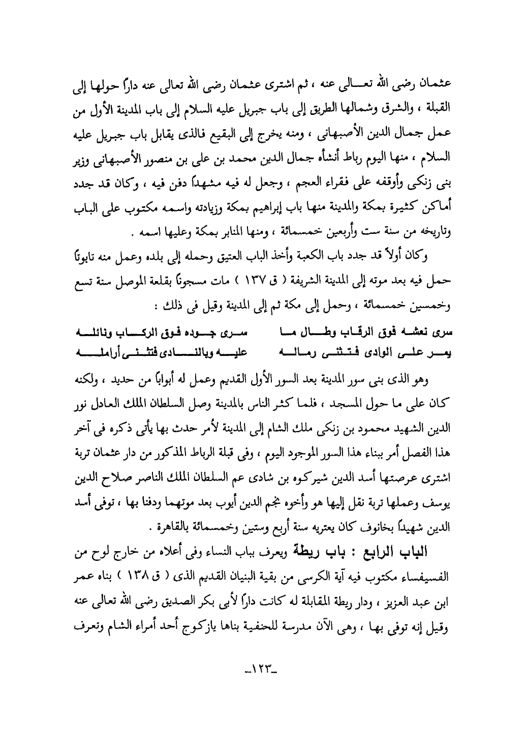 123…عثمان رضى الله تعالى عنه، ثم اشترى عثمان رضى الله تعالى عنه داراً حولها الى القبلة، والشرق وشمالها الطريق الى باب جبريل عليه السلام الى باب المدينة الأول من عمل جمال الدين الأصبهانى، ومنه يخرج الى البقيع فالذى يقابل باب جبريل عليه السلام، منها اليوم رباط أنشأه جمال الدين محمد بن على بن منصور الأصبهانى وزير بنى زنكى وأوقفه على فقراء العجم، له فيه مشهداً دفن فيه، وكان قد جدد أماكن كثيرة بمكة والمدينة منها باب ابراهيم بمكة وزيادته واسمه مكتوب على الباب وتاريخه من سنة ست وأربعين خمسمائة، ومنها المنابر بمكة وعليها اسمه.