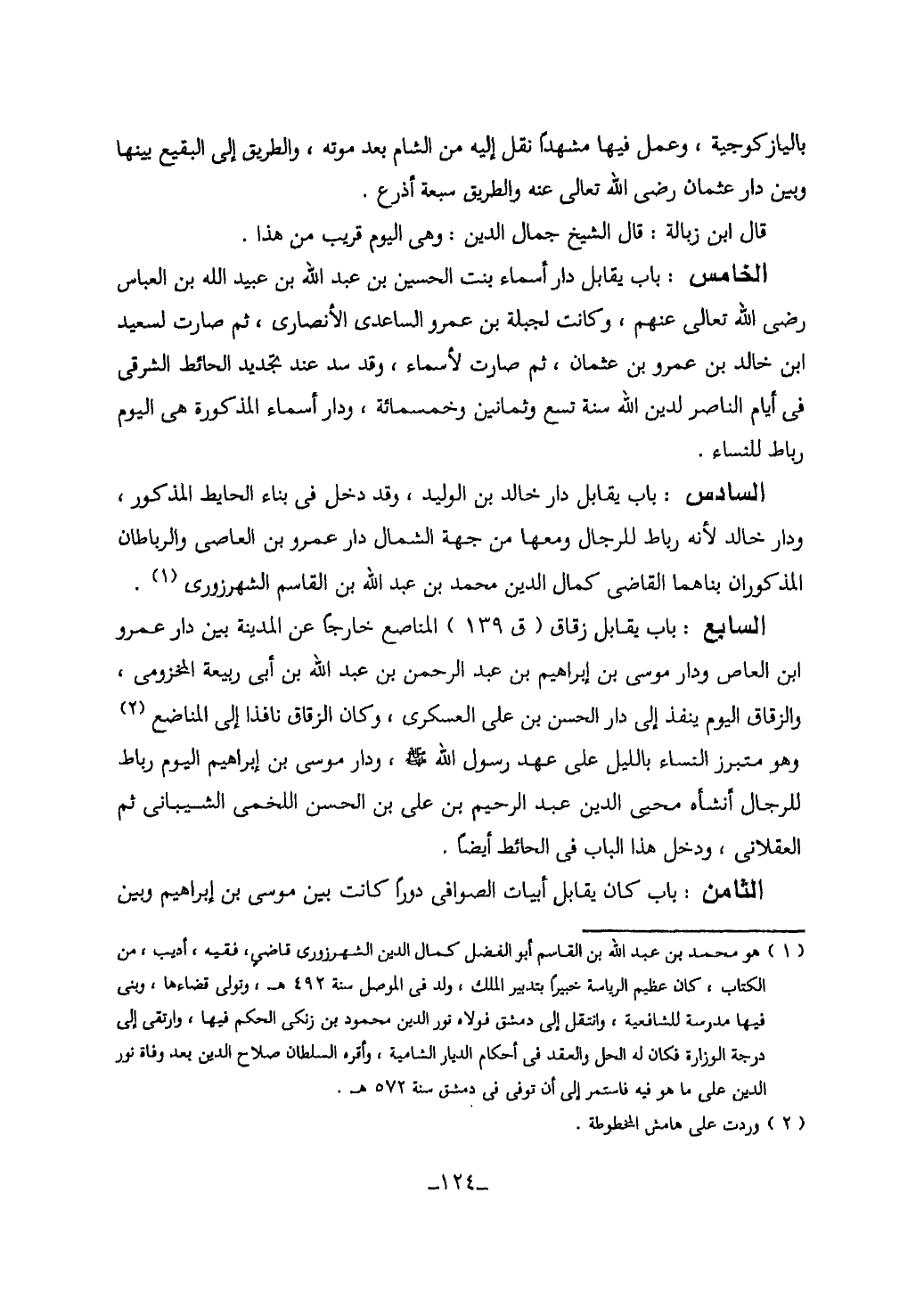 124…باليازكوجية، وعمل فيها مشهداً نقل اليه من الشام بعد موته، والطريق الى البقيع بينها وبين دار عثمان رضى الله تعالى عنه والطريق سبعة أذرع.