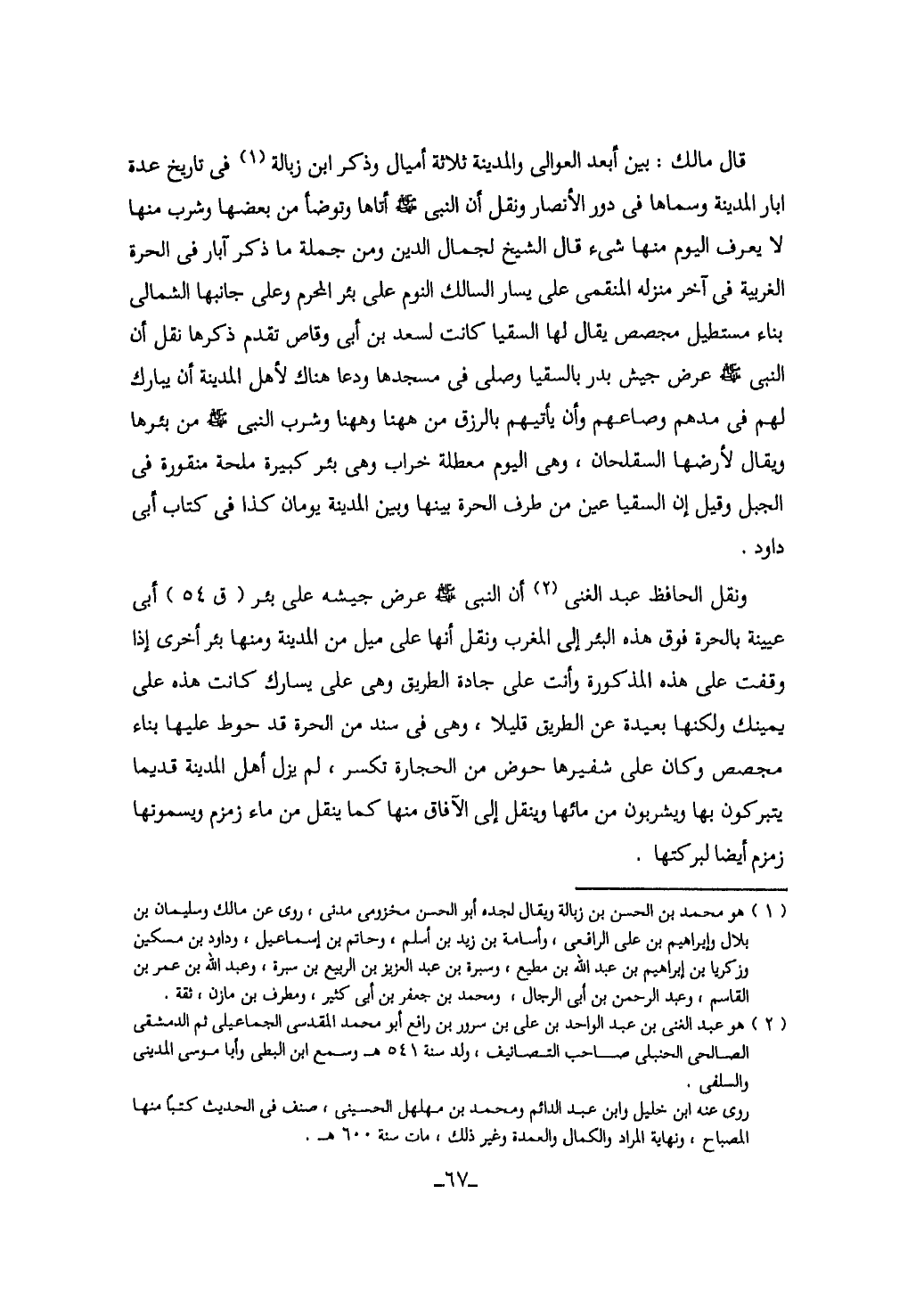 ونقل الحافظ عبد الغني (2) ان النبي صلى الله عليه وسلم عرض جيشه على بئر (ق54) ابي عيينة بالحرة فوق هذه البئر الى المغرب ونقل انها على ميل من المدينة ومنها بئر اخرى اذا وقفت على هذه المذكورة وانت على جادة الطريق وهي على يسارك كانت هسذه على يمينك ولكنها بعيدة عن الطريق قليلا، وهي في سند من الحرة قد حوط عليها بناء مجصص وكان على شفيرها حوض من الحجارة تكسر، لم يزل اهل المدينة قديما يتبركون بها ويشربون من مائها وينقل الى الافاق منها كما ينقل من ماء زمزم ويسمونها زمزم ايضا لبركتها.