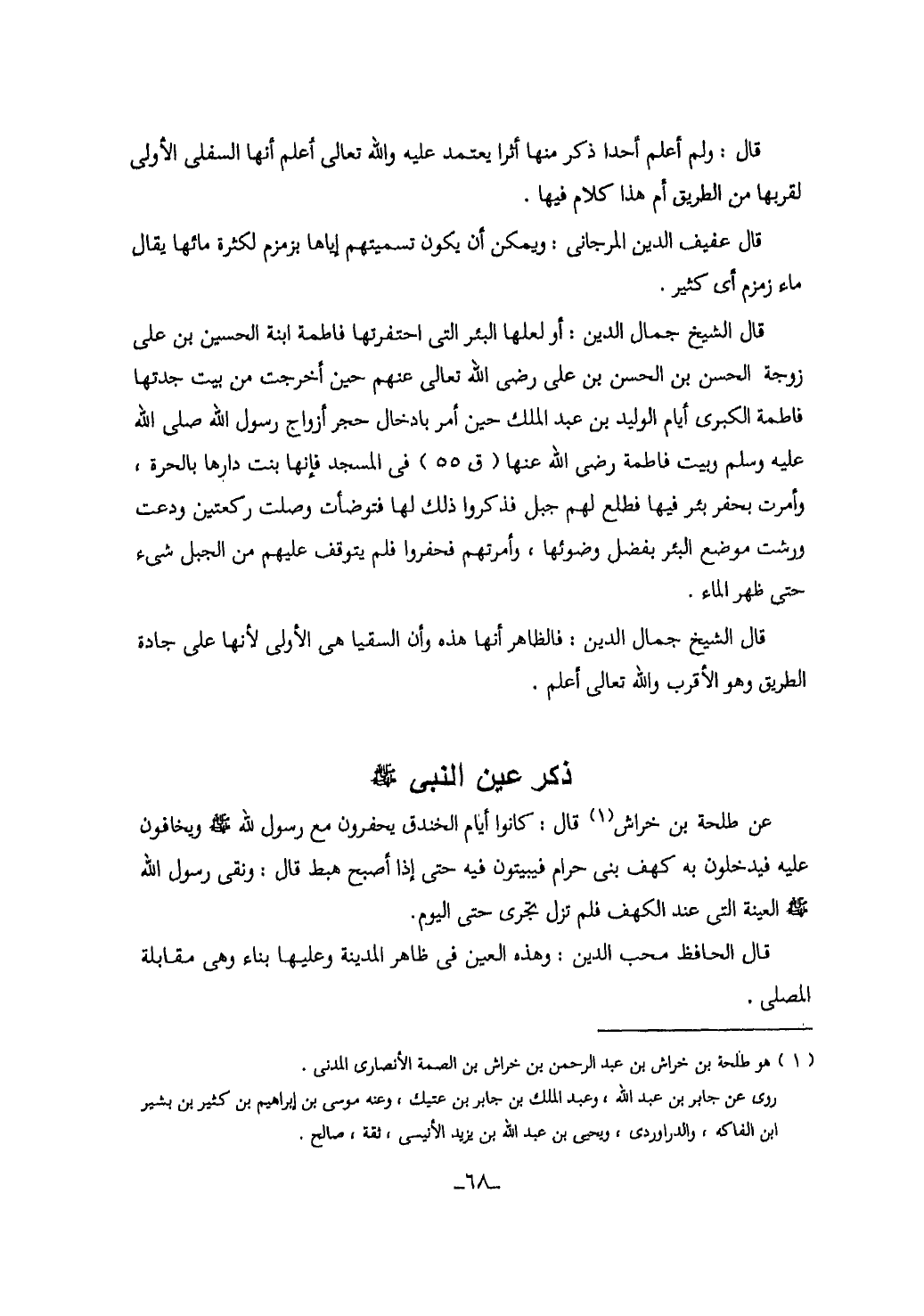 68…قال: ولم اعلم احدا ذكر منها اثرا يعتمد عليه والله تعالى اعلم انهاغ السفلى الاولى لقربها من الطريق ام هذا كلام فيها.