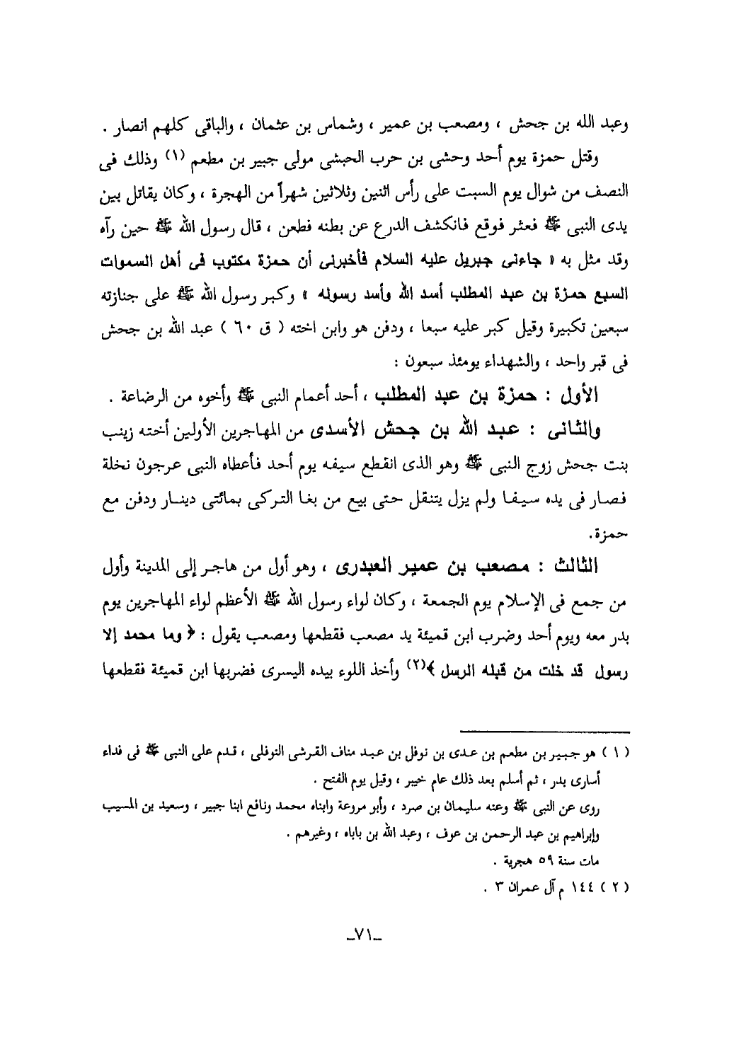 وقتل حمزة يوم احد وحشي بن حرب الحبشي مولى جبير بن مطعم (1) وذلك في النصف من شوال يوم السبت على راس اثنين وثلاثين شهرا من الهجرة، وكان يقاتل بين يدي النبي صلى الله عليه وسلم فعثر فوقع فانكشف الدرع عن بطنه فطعن، قال رسلو الله صلى الله عليه وسلم حين راه وقد مثل به "جاءني جبريل عليه السلام فاخبرني ان حمزة مكتوب في اهل السموات السبع حمزة بن عبد المطلب اسد الله واسد رسوله" وكبر رسول الله صلى الله عليه وسلم على جنازته سبعين تكبيرة وقيل كبر عليه سبعا، ودفن هو وابن اخته (ق60) عبد الله بن جحش في قبر واحد، والشهداء يومئذ سبعون: الاول: حمزة بن عبد المطلب، احد اعمام النبي صلى الله عليه وسلم واخوه من الرضاعة.
